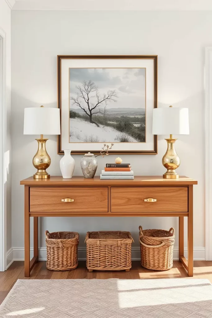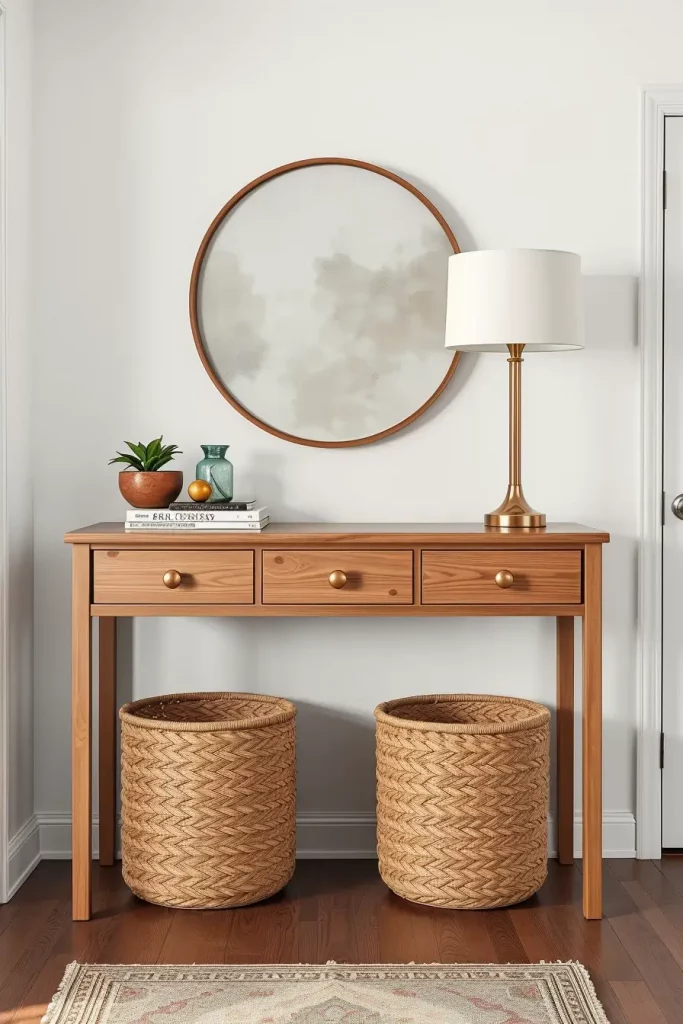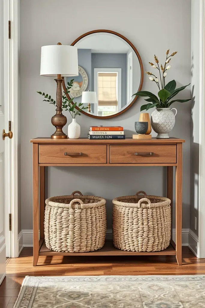 Maintaining order in the entryway of a busy household is a must. This is where stylish storage comes into play. When it comes to entryway tables, I always look for ones that have drawers or some sort of shelving. A well-positioned woven basket beneath the table can store shoes, mail, or even seasonal items, all while maintaining a sophisticated aesthetic.