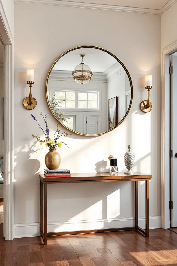One of my favorite tricks is combining a mirror with a nearby window or scone as this increases the light effect. A tip from Better Homes and Gardens mentions that round mirrors soften sharp hallway lines and invite a cozier feel.
