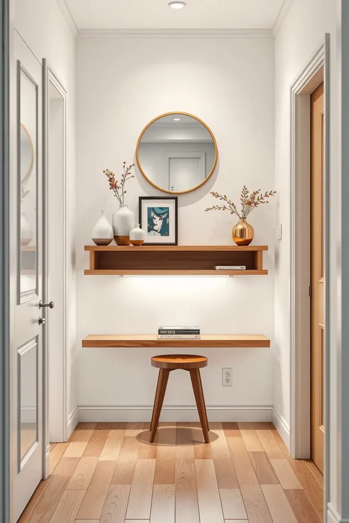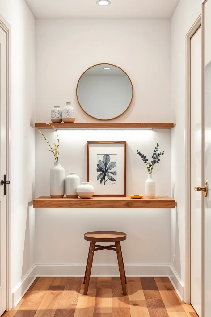 This approach has worked for me in city apartments where every inch counts, and it makes a huge difference. Apartment Therapy once showcased a Brooklyn loft with a floating shelf and a mirror that created a gallery-like entry moment—and it was only three feet wide! For my own floater, I mounted a shelf over a marble tile accent wall, combining elegance with minimalism.