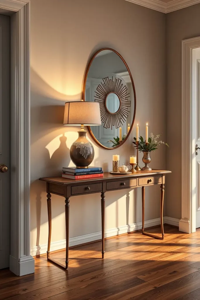 To create a uniform look, place matching table lamps or candle holders on either end of the console. Completing the axis is a central mirror or a piece of artwork, while symmetry for the axis can be dominated by the symmetrical shape of a part. For asymmetrical styling, stagger taller items with lower ones, like a tall vase on one side and smaller frames on the other. Both methods can achieve polish with the right balance.