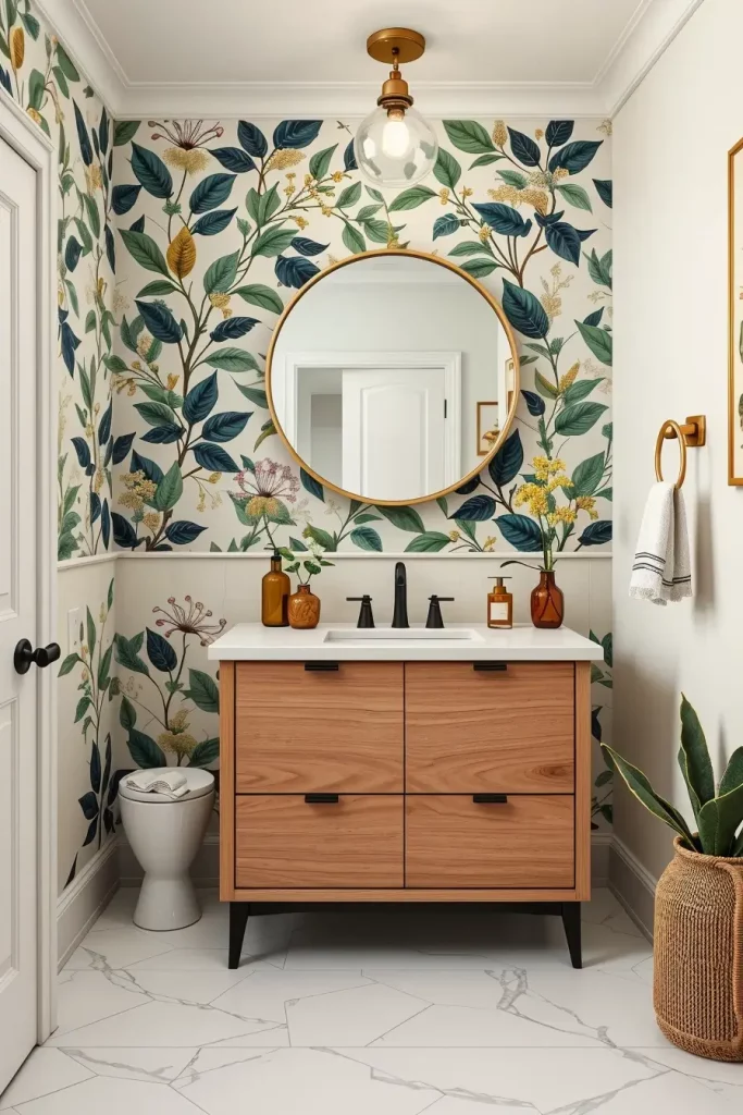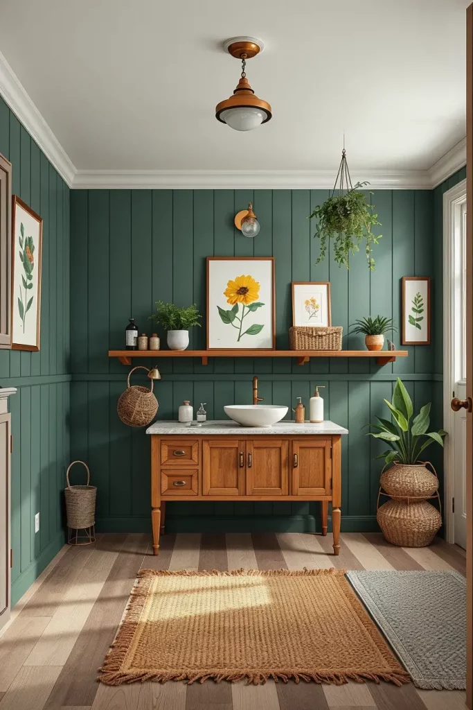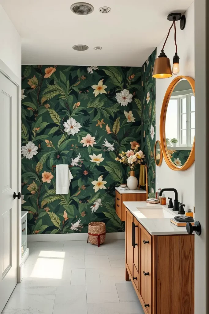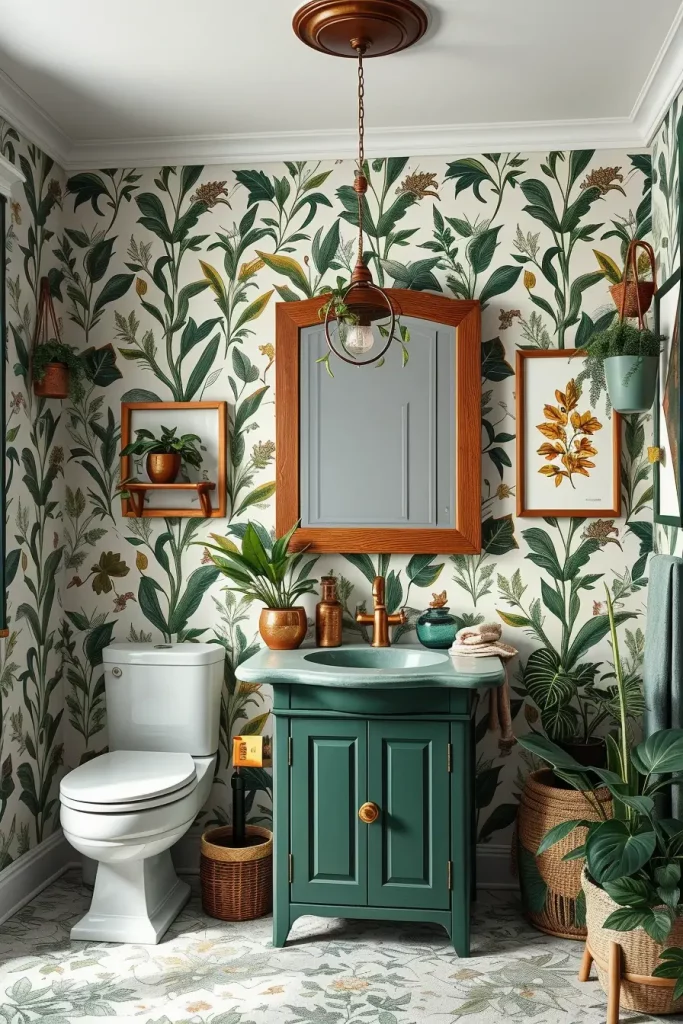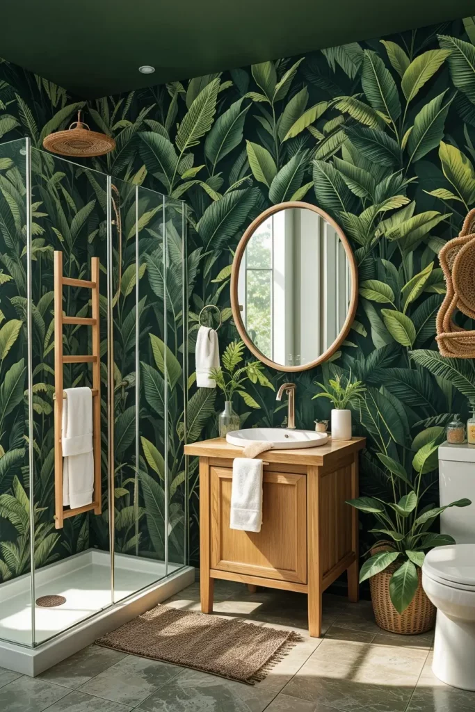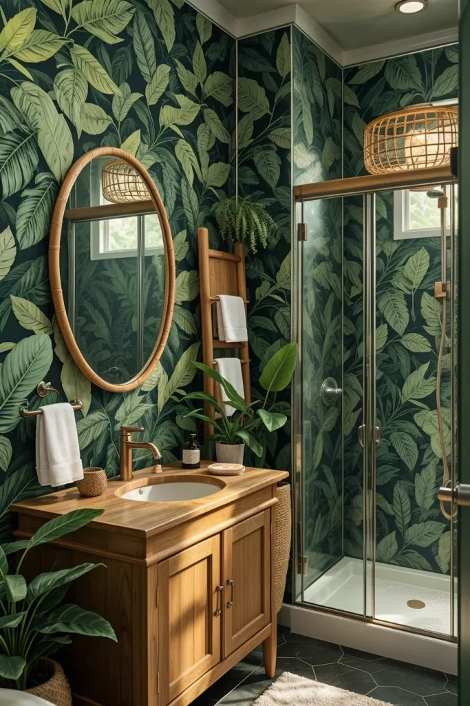 I often recommend botanically inspired wallpaper, pressed plant art, and fresh greenery such as ferns and snake plants. Forest green vanity or tile paired with wood framed mirrors and natural fiber rugs maintains the theme. Leaf printed green towels and ceramic planter more finished the look.