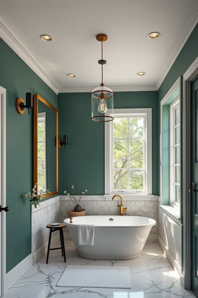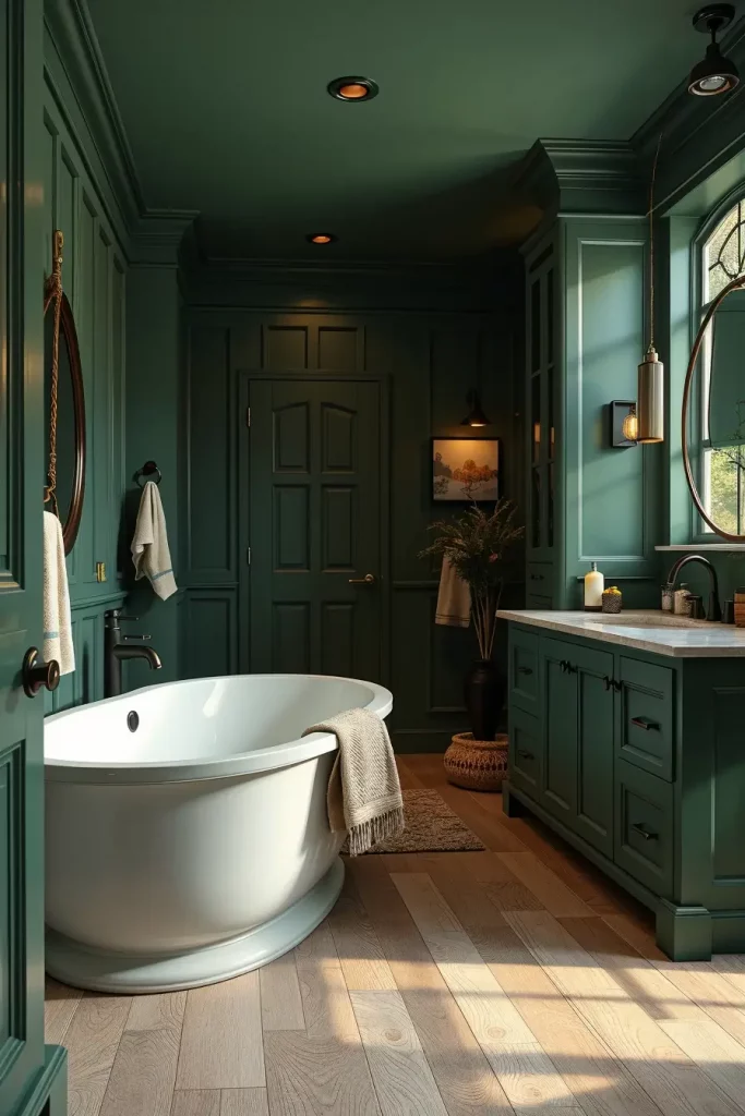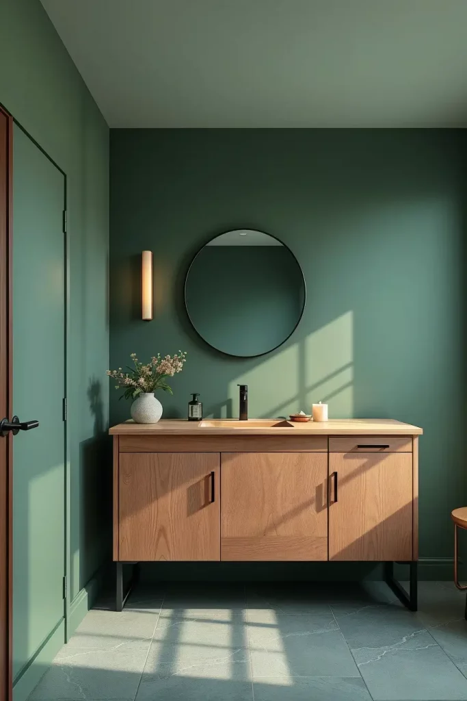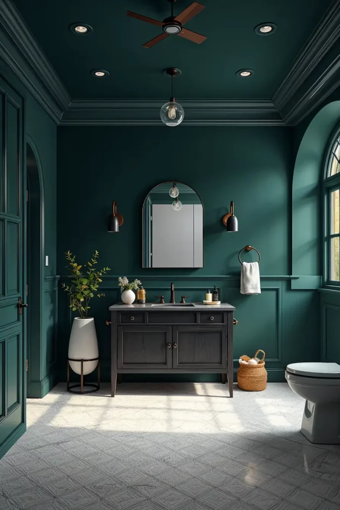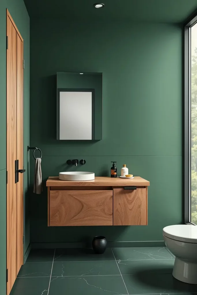 Consider coming into contact with forest green to provide a deeper striking impact by painting the bathroom walls. In this configuration, I opted for a full monochrome approach on the walls and ceiling, which provides the space a bold cocoon-like effect. Oppositely placed fixtues and lighting gives dark hues as a canvas.