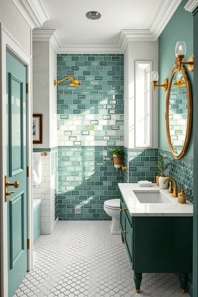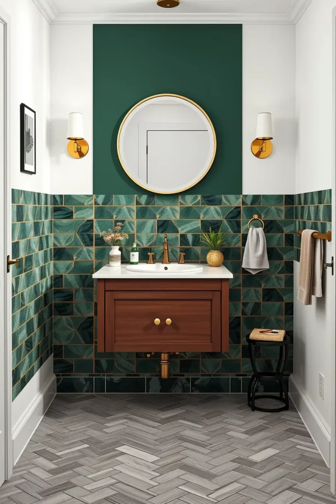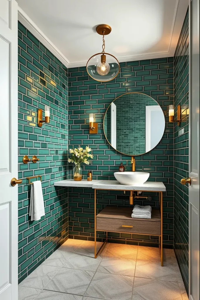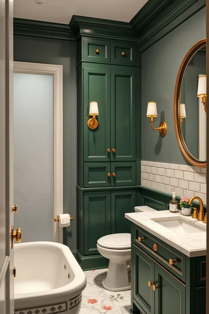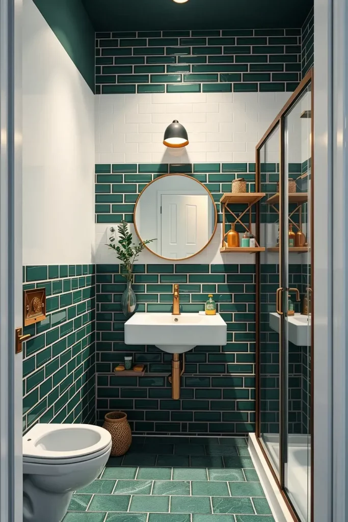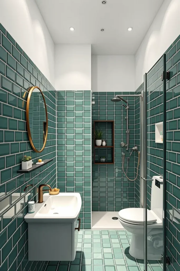 I personally do like incorporating gloss green subway tiles on the bottom half of the walls and white or light grey paint above to keep up the spacious illusion. The room can be visually expanded with mirrored cabinets, wall-hung toilets, and floating vanities. The narrow vertical shelving in forest green offers storage without bulk, and frameless glass showers or curved glass panes add to the sleek look while optimally maximizing floor space.