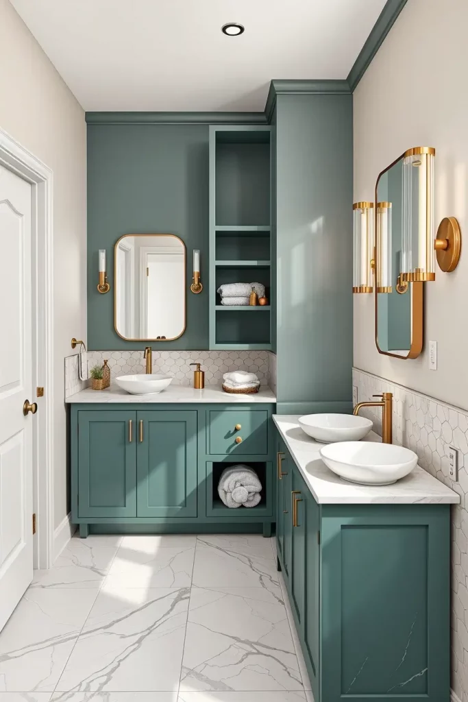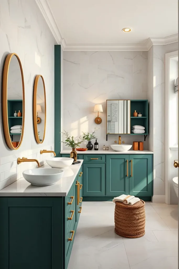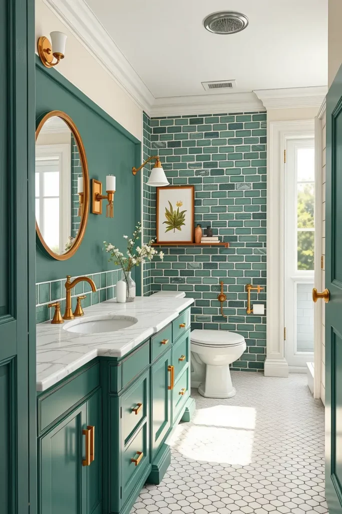 For those seeking clarity with a level of contrast, the combination of forest green and white creates an organized balance. Here, I aimed for a balance of white tiles and fixtures themselves with green cabinetry and accent walls to achieve a balanced environment.