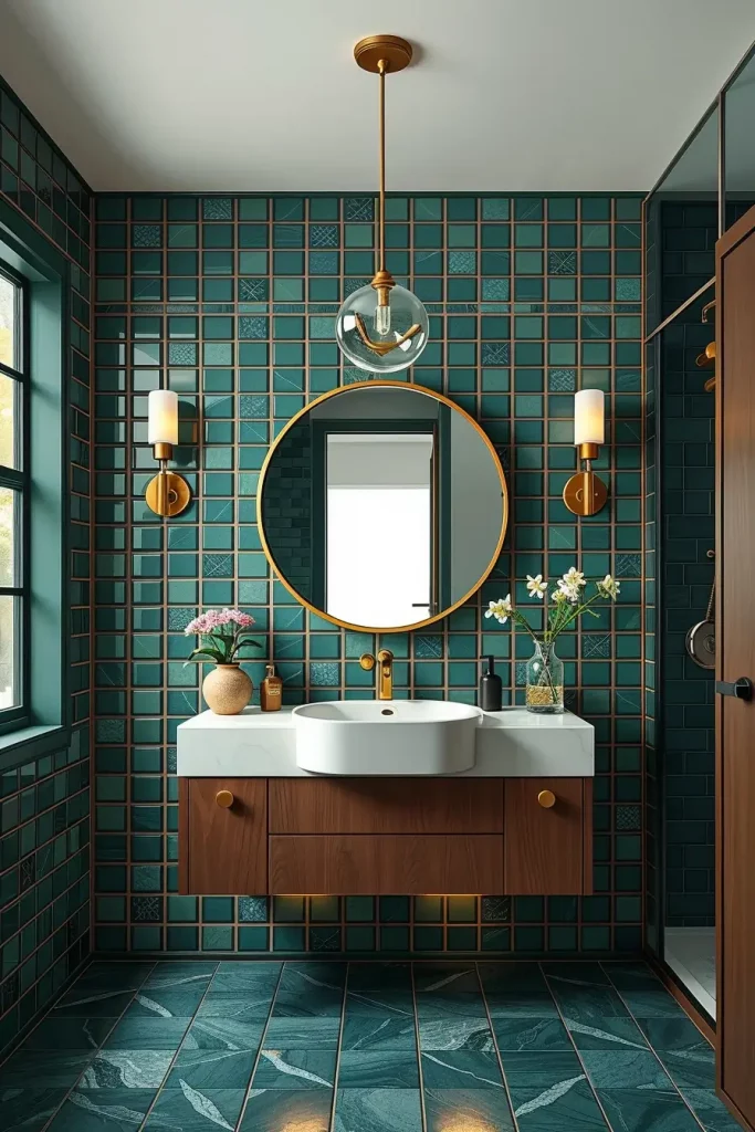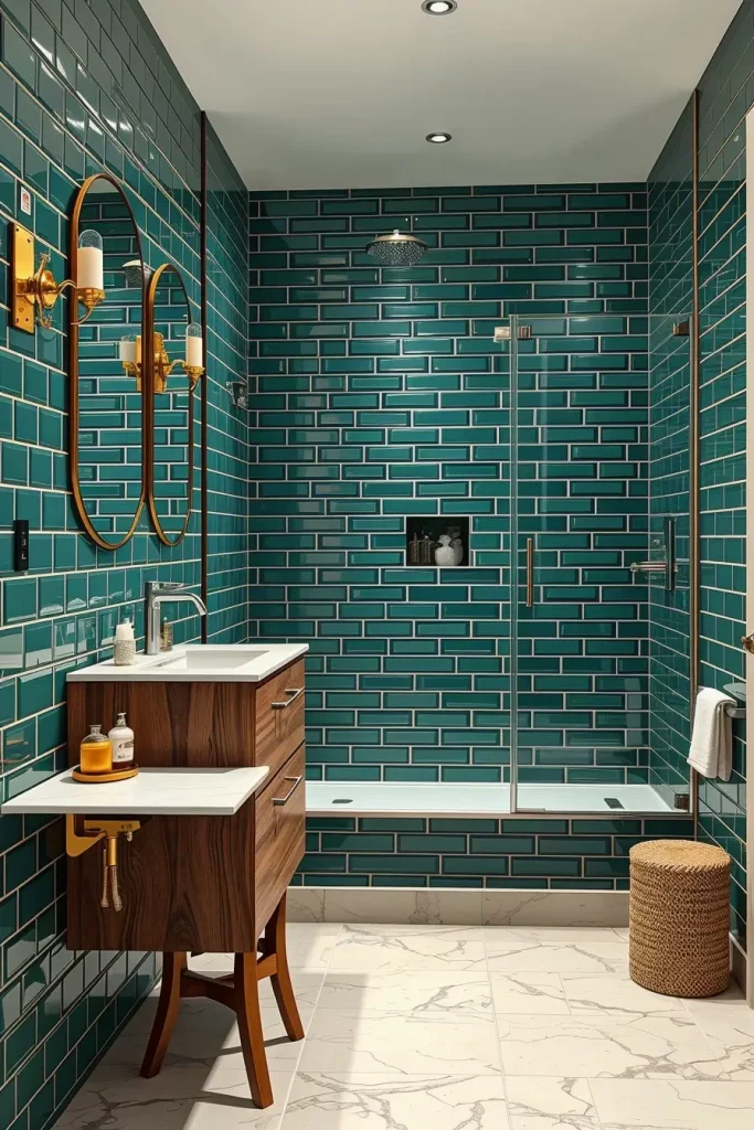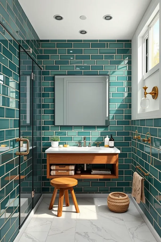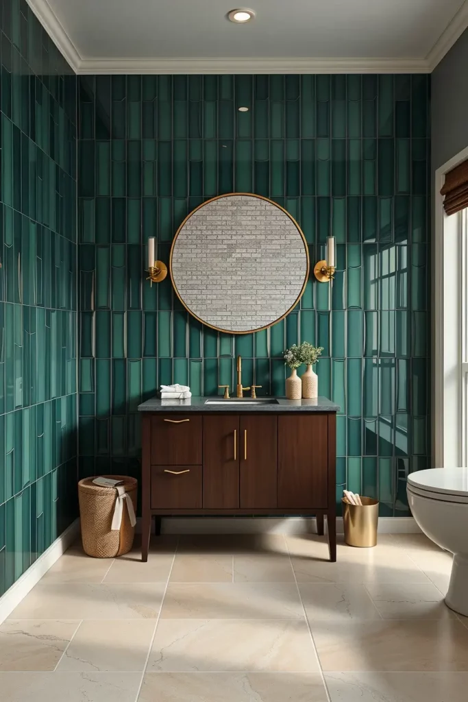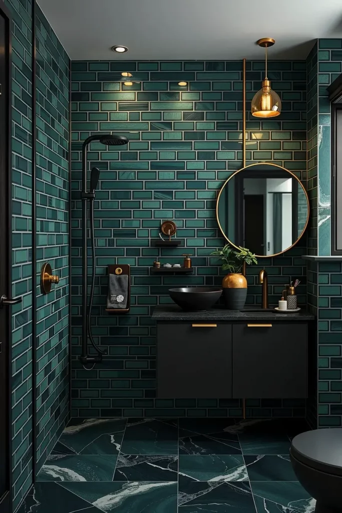 As a final touch, forest green tiles work great alongside bathroom fixtures as a color backdrop for a sophisticated look. It does not matter which type of tile it is, whether glossy subway tiles, scalloped zellige, or geometric porcelain, this color is guaranteed to transform any room. For this configuration, I put in vertical stacked emerald tiles behind the sink and gave them a modern sleek look.