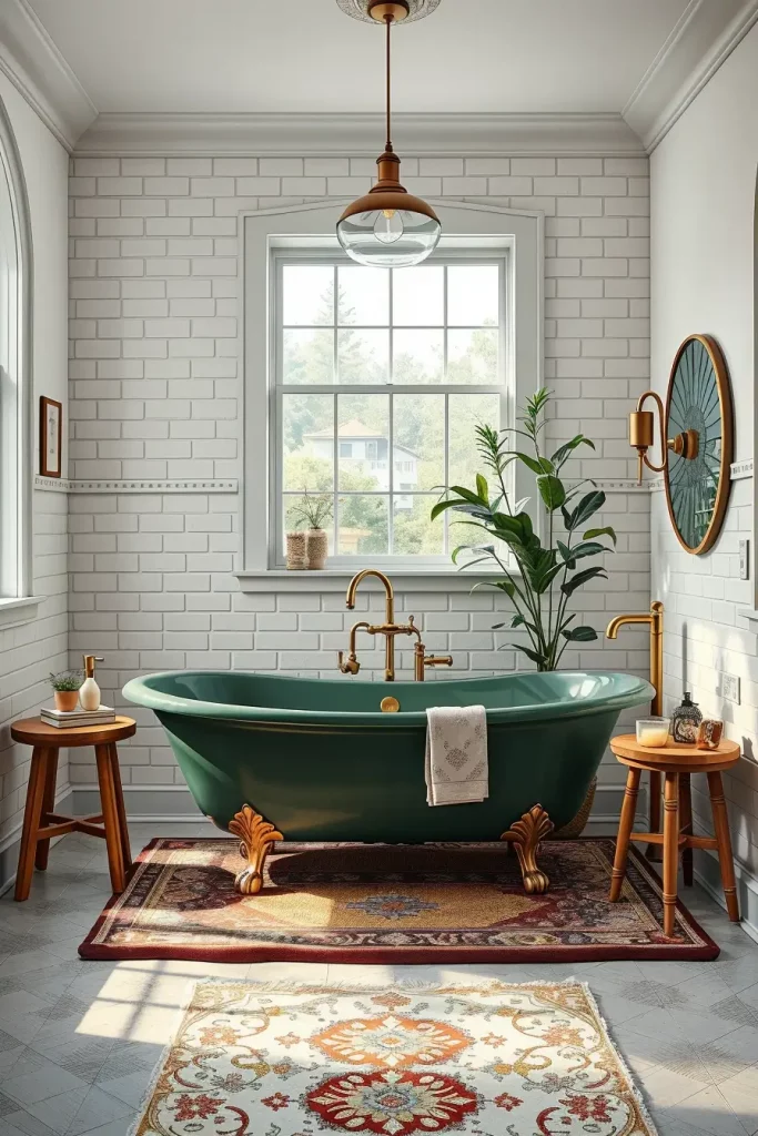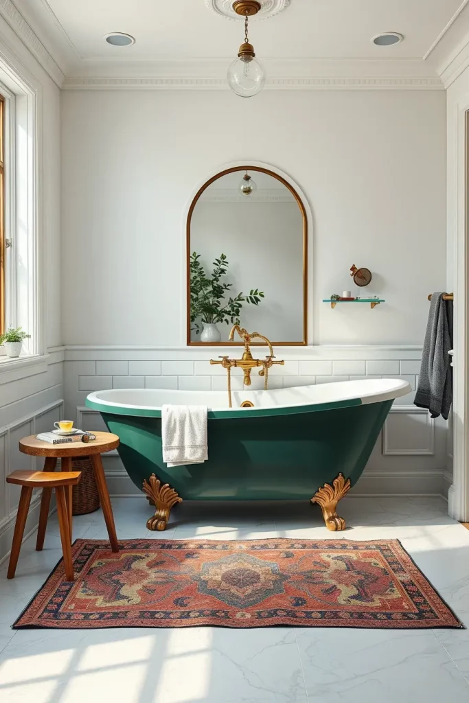 The freestanding tubs in forest green look visually pleasing in both traditional and modern bathrooms. Personally, I enjoy using matte finishes for a more contemporary look, whilst enamel-coated or cast iron options have timeless charm. Topping the tub with gold fixtures or a wooden bath tray introduces contrast and warmth. Place an antique rug underneath, and you have an eclectic yet harmonized space.