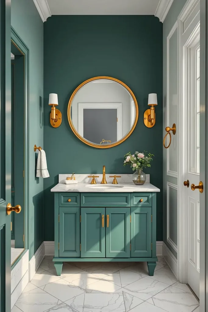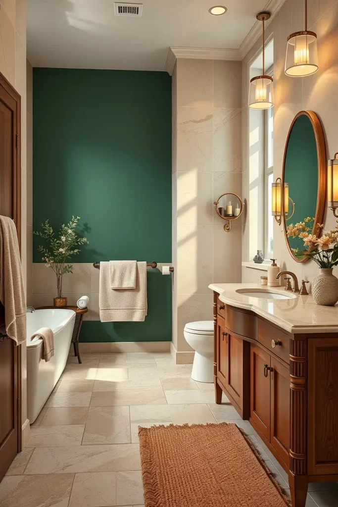 A forest green accent wall is a great way to ease into this commanding color, if you’re not ready to fully commit yet. It’s a straightforward approach to introduce some depth and contrast into a bathroom without taking over the whole space. I often suggest this for powder rooms or small guest bathrooms that make use of strong visual elements.