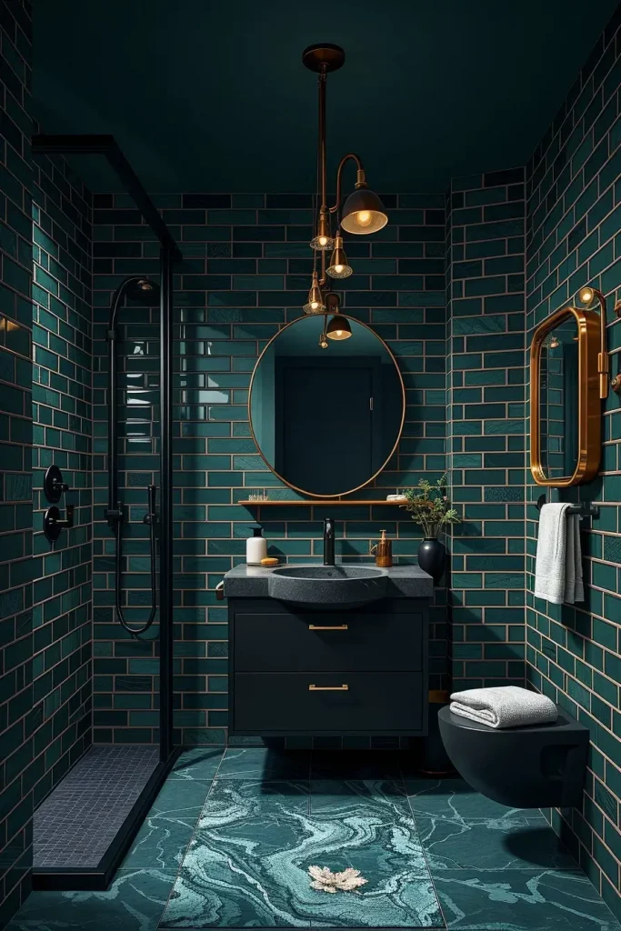 Combining forest green and black in a bathroom can feel both striking and contemporary. These colors work great if you want a space that feels luxurious and bold. I often suggest this to clients who are not afraid of dark spaces and want an aggressive design focal point.