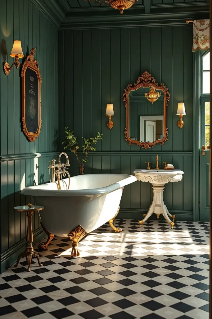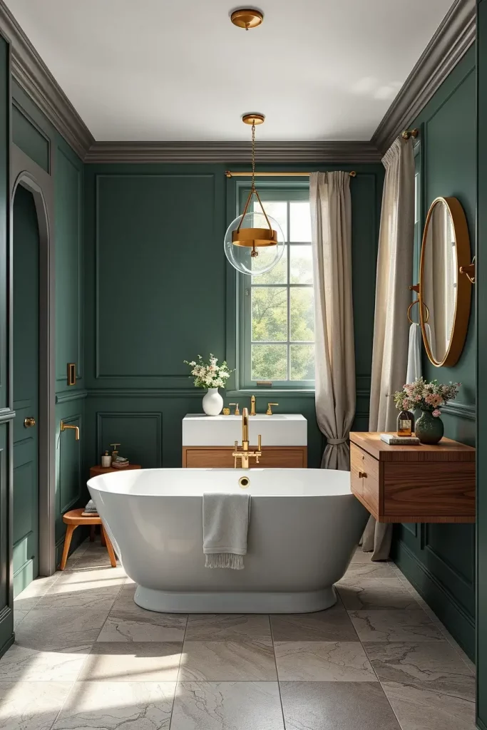 My favorite thing about forest green is how well it pairs with just about any personal style. For lovers of modern minimalism, Scandinavian cool, or even classic elegance—this color compliments all tastes. In traditional homes, I often go for forest green wainscoting paired with vintage vanities. More contemporary spaces can benefit from a striking forest green accent wall that sits behind sleek floating cabinetry and sculptural lighting. This versatile color can serve as an anchor or accent, and works wonderfully with various designs and schemes for bathrooms.