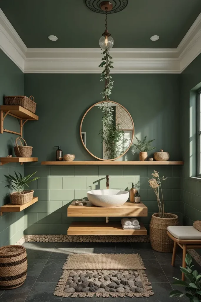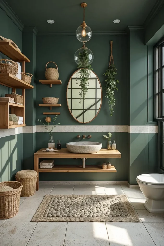 Styling a forest green bathroom requires the melding of nature through wood, stone, and greenery accents to create a balanced warmth. In this case, I chose to have green walls along with textures of nature such as bamboo shelves and pebble style bath mats, complemented with rattan baskets. All this combined creates spa-like feel which is refreshing but not overwhelming.