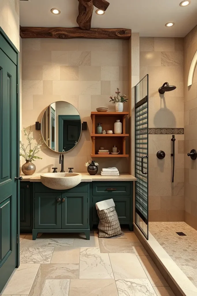 My personal favorite for this style is using river stones as a flooring option for walk-in showers. These things paired with green tile are a stunning visual and feel great underfoot. Architectural Digest suggests this pairing has become a rising favorite for 2025 bathroom renovations. Furthermore adding real plants, such as snake plants or ferns, seem to visually and environmentally uplift the space.