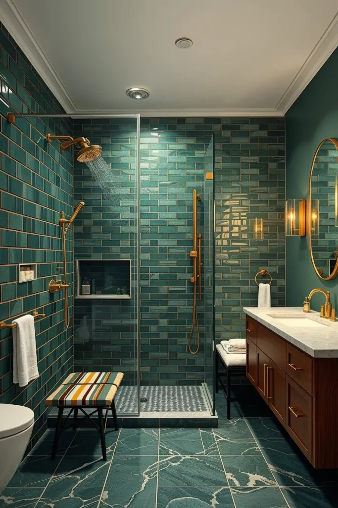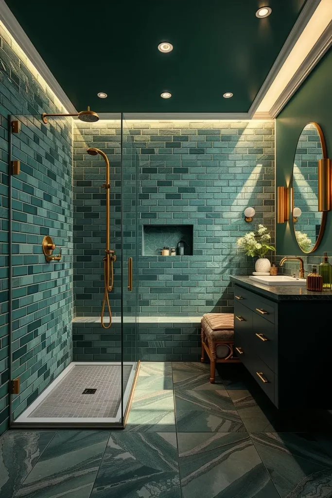 For my projects, I like to place green tile either within the boundaries of the shower enclosure or across the adjacent accent wall. The frameless glass ensures cleanliness and prevents distracting visual barriers. For clients who want more of a defined structure, black or brass trim around the glass softens and enriches the look. A floating bench enclosed adds comfort and visual intrigue.