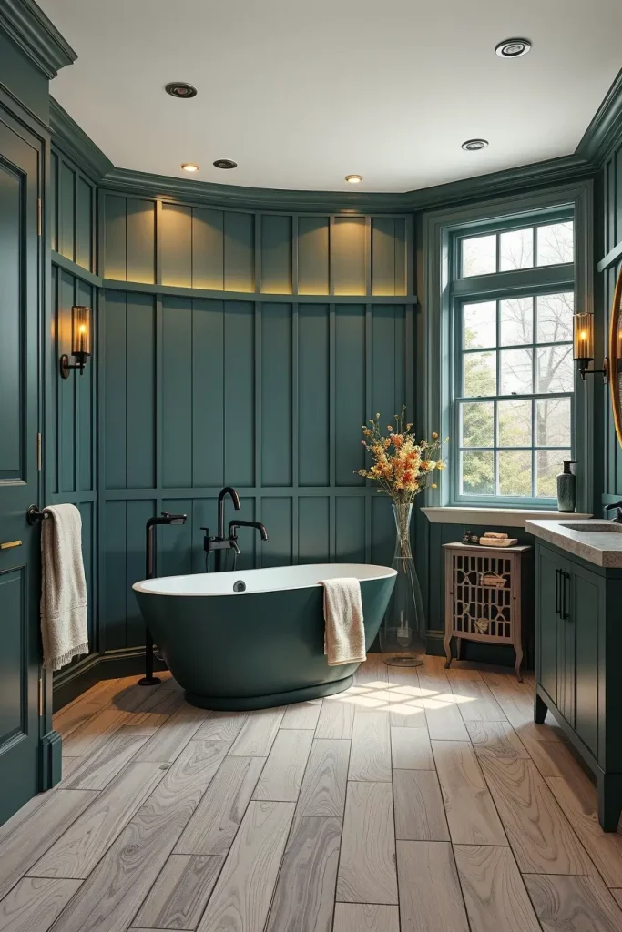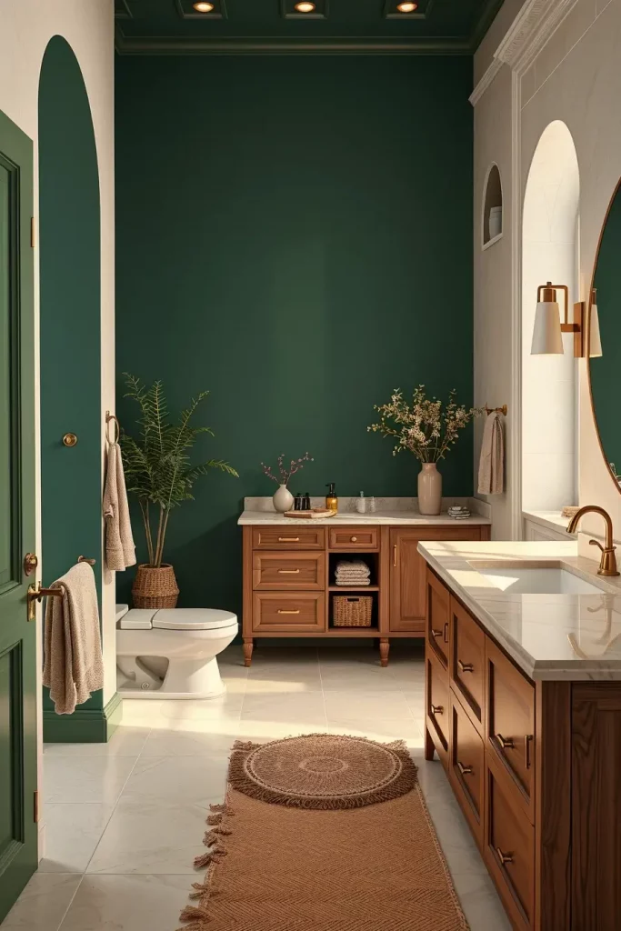 When it comes to enhancing a forest green bathroom, my first option is always strategical texture. It is not ever the case that tiles and panels in this color tone don’t contribute movement or depth, rather, in fact, they provide a room with a tactile character that has the potential, or rather the capability, to morph a flat room into a retreat with a dynamic essence. An example of this is, I like using glossy emerald green subway tiles for the shower or accent walls and matte forest green wall panels or board and batten designs for the rest of the walls.