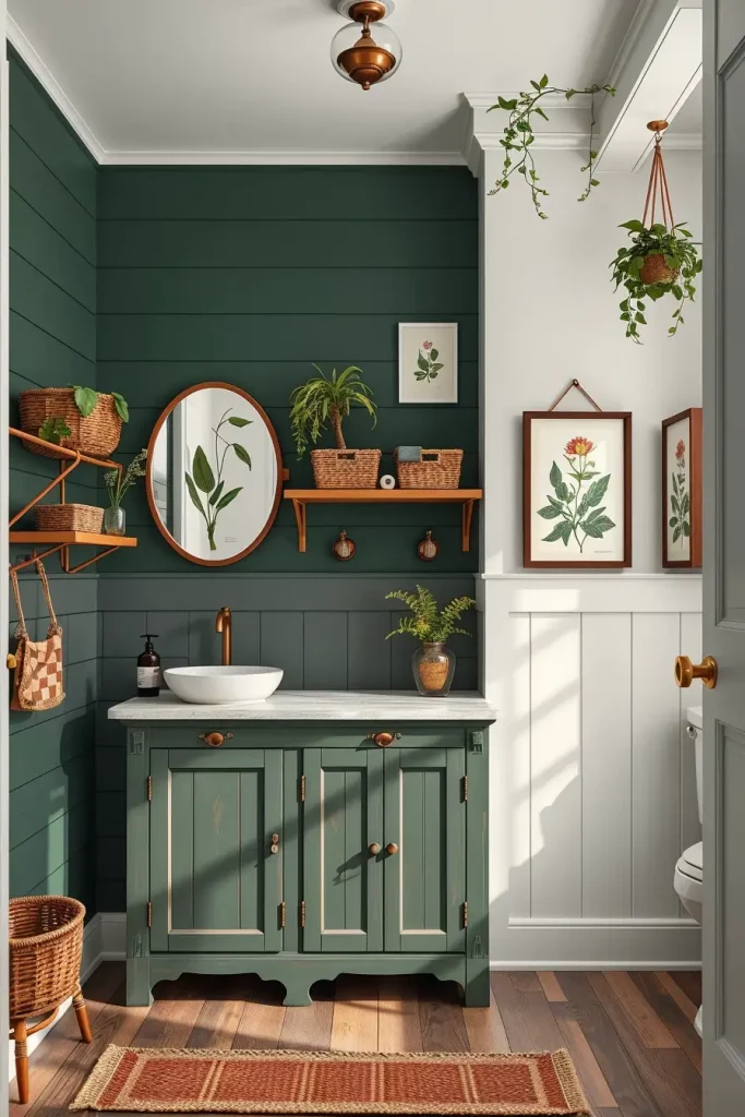 In my experience, pairing shiplap walls with forest green invokes a warm and sophisticated rustic feel. It works well in bathroom settings by adding a calming spirit, while shiplap provides eye-catching warmth and texture. The timeless yet fresh vibe is perfect for all size bathrooms. The forest green on the lower halves of the walls instills a cozy atmosphere, with shiplap textures greeting the neutrals on the top half.