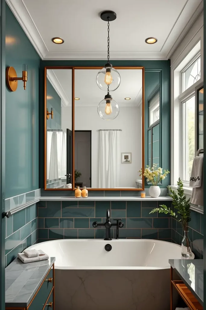 All too often, I combine chandeliers, vintage-inspired sconces, or sculptural pendants forest green walls or tiles. They serve as eye-catching decorative touches for the room. One time, I put a blown-glass globe pendant above a freestanding tub that had forest green tiling behind it, and the fixture became the room’s centerpiece. Brass is particularly striking. juxtaposing the cooler tones of green with warm colors adds a delightful contrast.