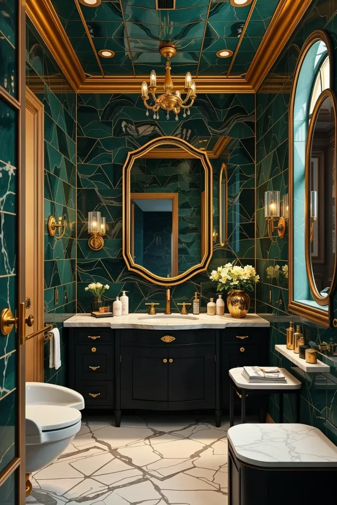 Personally, I suggest using gold sparingly, just enough to catch the light but not to overpower the green. According to House Beautiful, bathrooms with gold accents and green tones instantly turn dramatic and cool palettes become warm, which is why they serve as great focal points. This is a trick I’ve used in a number of upscale condo projects.