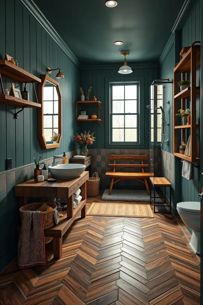 The design includes mirrors clad in wood frames, wooden shelves for towels and decorations, and a wooden slatted shower bench. The floor is dressed with herringbone oak-style planks while a sink is mounted onto a reclaimed wood counter. Completing this rustic look are hickory beam lights that accent the washroom from above.