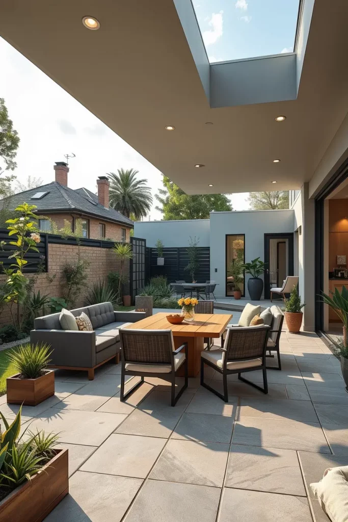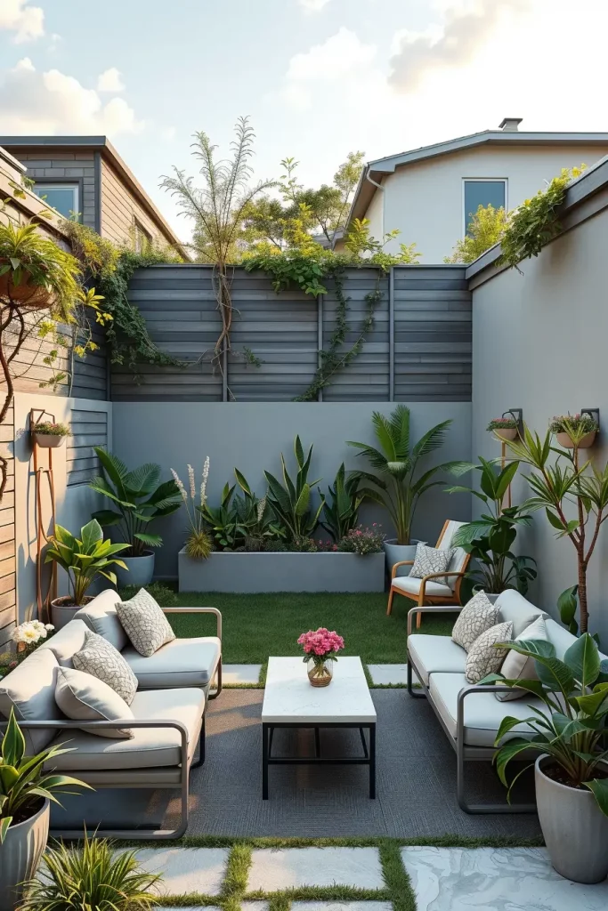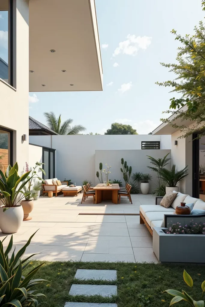 I rely on slim-profile furniture, built-in benches, wall-mounted planters, and multifunctional elements such as seating with hidden storage. Light-colored surfaces, reflective materials, and consistent flooring help visually expand the space. Plant selections are deliberate, favoring vertical growth and clean silhouettes over dense planting.