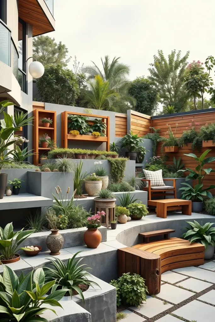 In these gardens, I integrate tiered planters, raised platforms, retaining walls with integrated seating, and vertical green walls. Materials such as concrete, wood, and metal help define each level, while plants are selected based on height, texture, and growth habit. I carefully balance greenery with structure so the garden feels dynamic but not overcrowded.