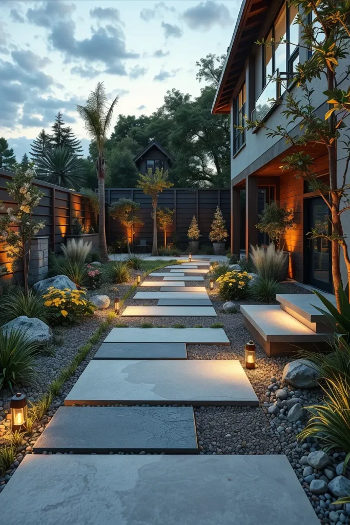 I often use oversized stepping stones, floating concrete slabs, or mixed-material walkways combining stone, gravel, and wood. Spacing, alignment, and texture are carefully considered to ensure both comfort and visual rhythm. Integrated lighting and subtle elevation changes add further interest and practicality.