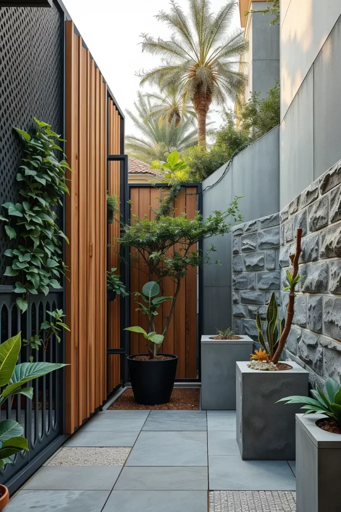 Materials such as perforated metal panels, textured concrete, slatted wood, and composite screens allow for light filtration while maintaining enclosure. I often recommend combining these surfaces with climbing plants or integrated planters to soften the look and blend built elements with nature. This balance creates a stylish and unusual garden character.