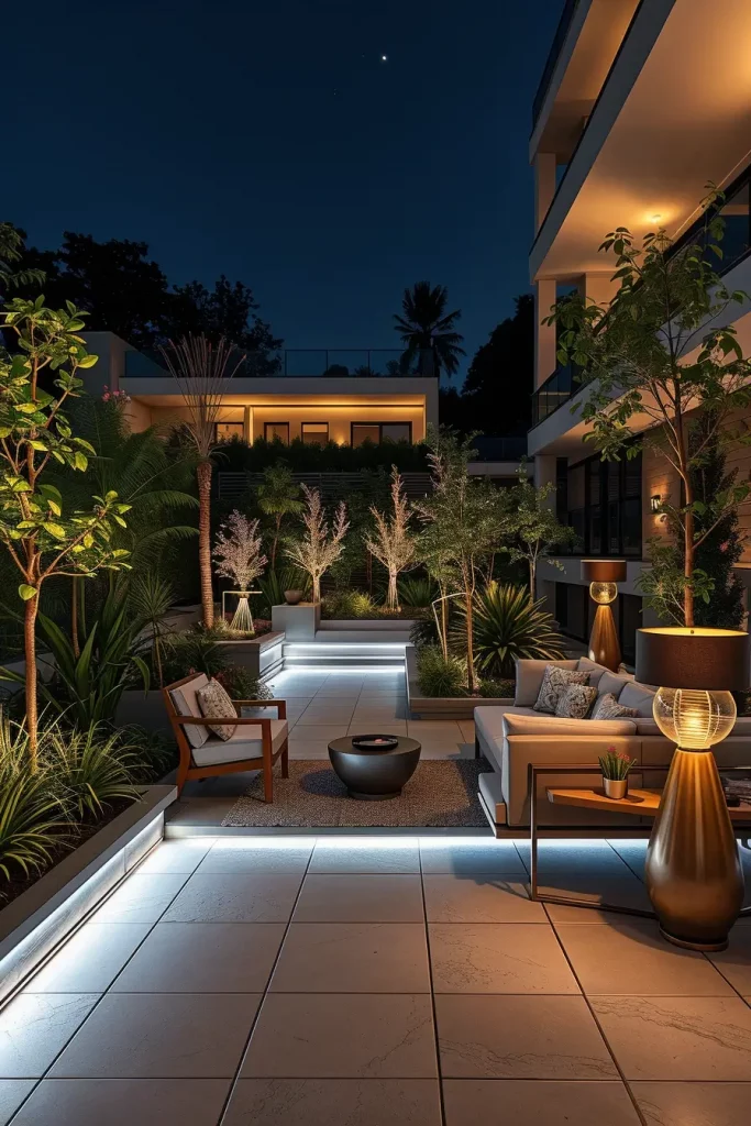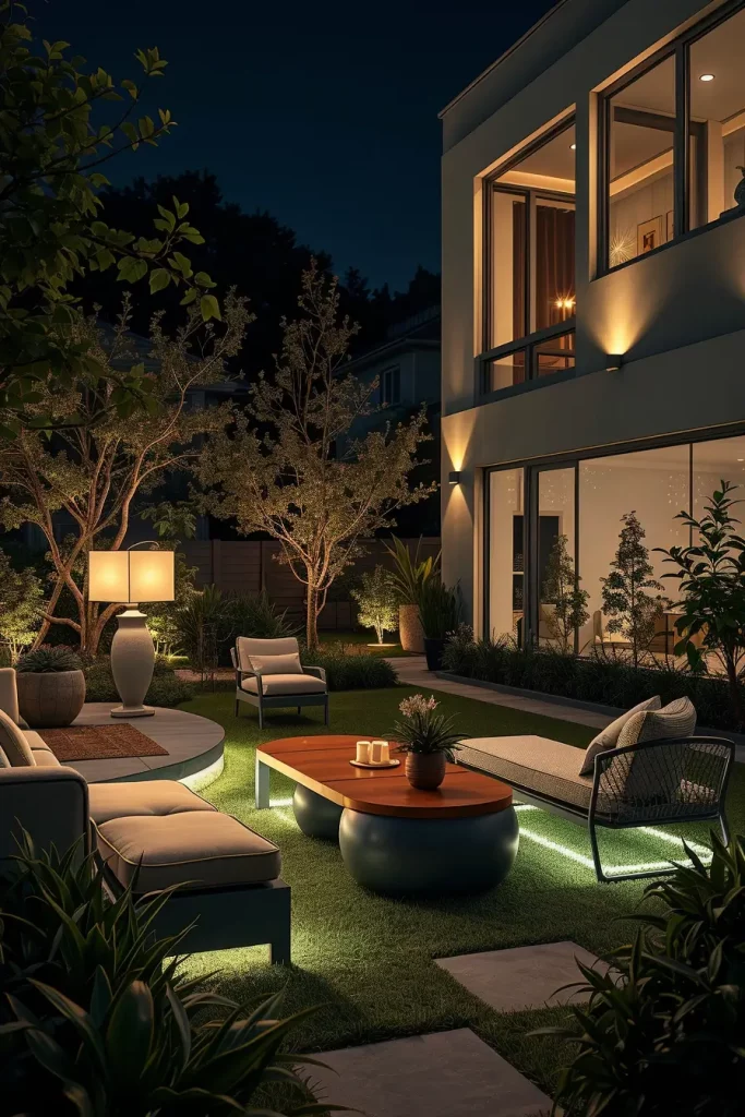 In practice, I rely on recessed pathway lights, indirect LED strips under seating, sculptural floor lamps, and subtle uplighting for trees or architectural features. These elements work together to define zones while maintaining visual harmony. Furniture with soft silhouettes and textured surfaces reflects light gently, reinforcing a designer and stylish nighttime aesthetic.