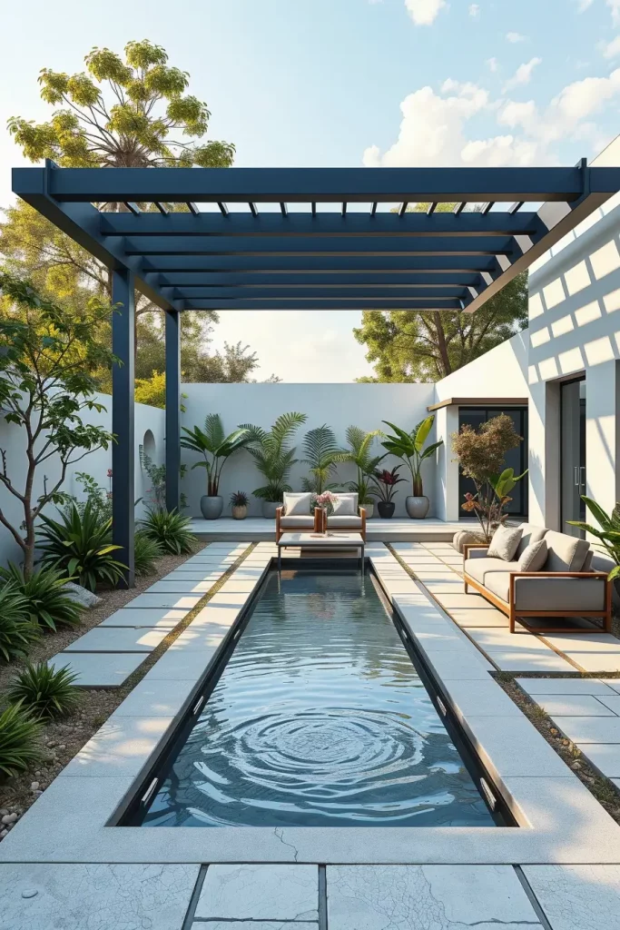 In terms of design elements, I rely on geometric paving patterns, floating platforms, integrated LED lines, and low-profile furniture with sculpted forms. Materials like polished concrete, composite decking, and metal accents work well together, reinforcing a high-tech yet livable atmosphere. Each item earns its place by contributing to clarity, comfort, and long-term durability.