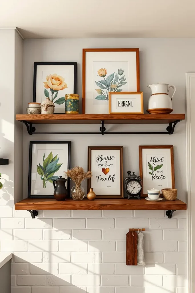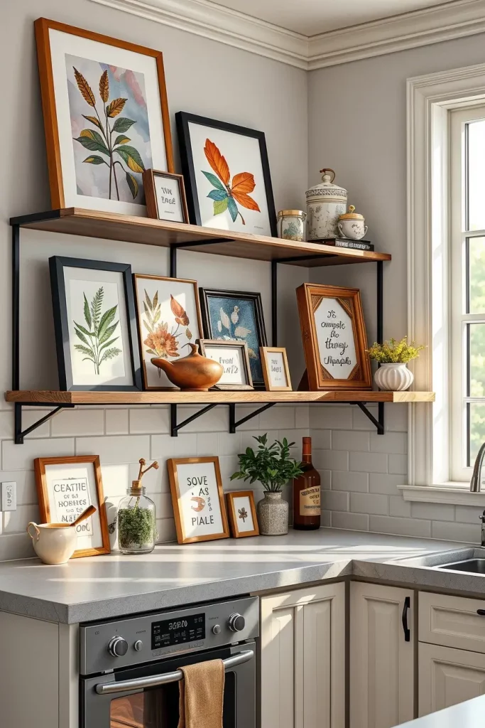 Layering Framed Art Prints On Kitchen Open Shelves