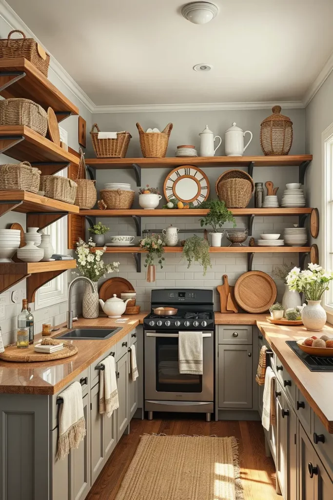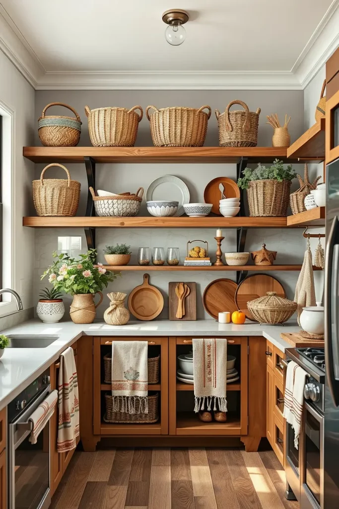 I use small lidded baskets to store tea bags, while larger woven trays are great for displaying dish towels or bread. I even repurpose rattan trivets into wall decor that hang next to my shelves. Combining different materials and sizes is the main trick—use a blend of seagrass, wicker, and jute for a more effortless collected aesthetic.