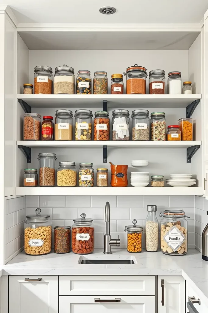 I usually suggest using glass jars or acrylic tubs with airtight lids. Also, remember to organize them by height or fill level, and don’t forget to label them for both function and style. Oats, lentils, pasta, and flour are some examples of what can be displayed. For a cohesive look, uniformity in shape and material of the lid is important.