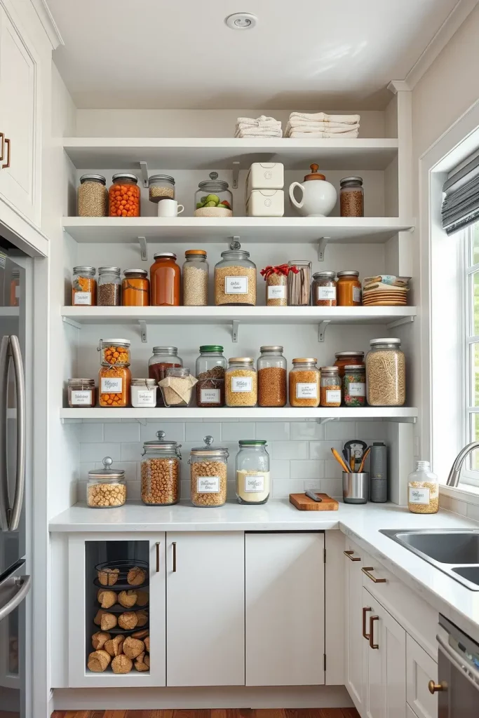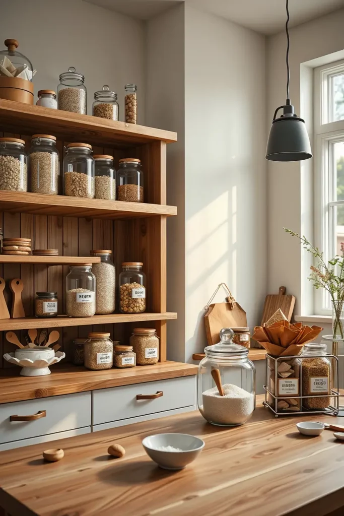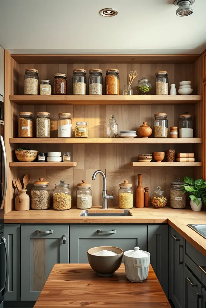 In my experience organizing plates by size works best, neat stacks of cups or mugs grouped nearby always look great. Earthy wood cutting boards leaning against the walls bring style, combined with dry goods in ceramic canisters soften the space further. Glass jars filled with pasta or rice not only provide texture but also improve visibility for inventory. These jars encourage daily use while helping reduce clutter in cabinets.