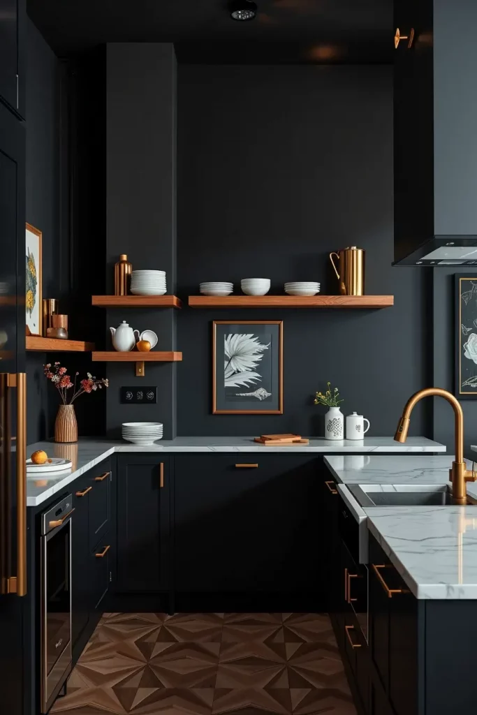 Ceramic white dishes, some kitchen brasses, and pantry staples stored in glass containers introduce contrasting textures, and forwerking together looks even better on my matte black slab wall where I place floating wooden or walnut toned shelves. A few black framed artworks resting casually against the wall also create depth and character while subtly tying into the overall theme.