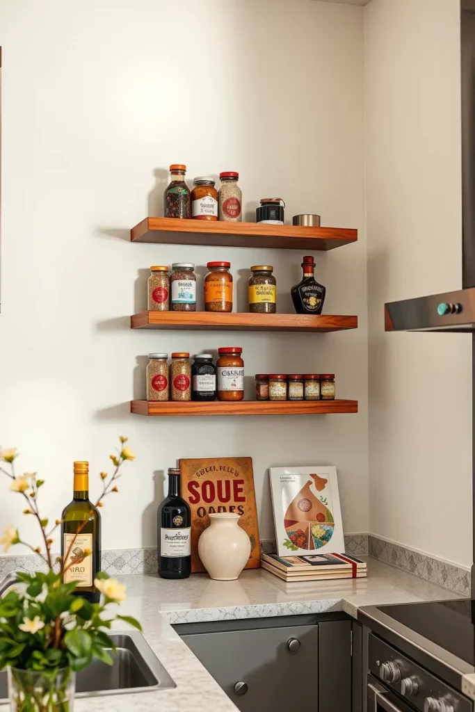 In my experience, three stacked floating shelves or one above the other on a corner or above the sink works wonders. Things like herb containers, olive oil, and cookbooks can all be kept on those shelves. The top shelf works fine for decorative objects—a small framed quote or something like a ceramic vase with texture works perfectly.