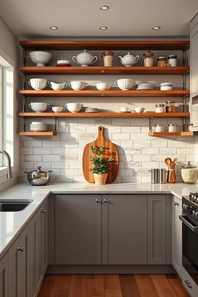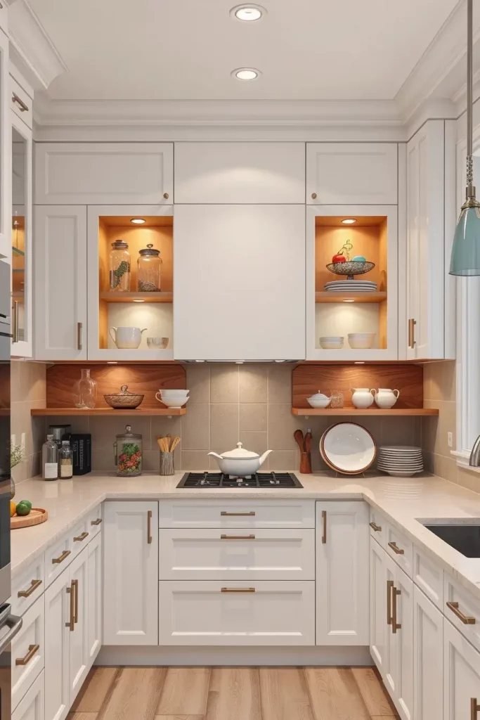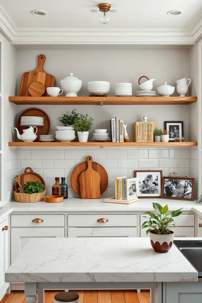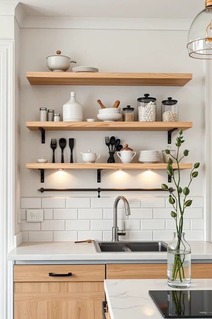 The most striking combinations are white cabinets and natural wood open shelves. To add charm, I place family heirlooms or vintage dishes inside glass jars without going overboard in terms of staging. Most of the time, a small lamp or light positioned under the shelf would complete the look.