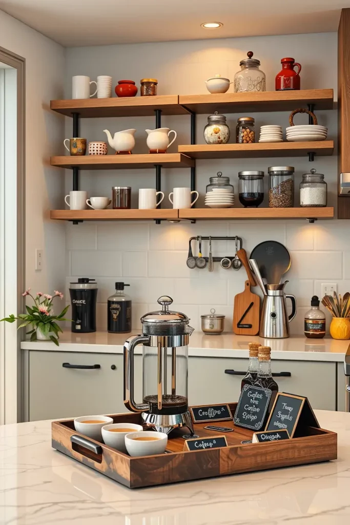 Begin with installing two floating wooden shelves above a coffee cart or a countertop. On the shelf I would place mugs, glass containers with sealed coffee beans, a french press, and perhaps a small tray for spoons or flavored syrup. To top it off use roll labels and use woven baskets for an inviting cafe feel.