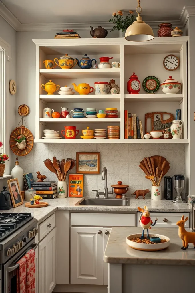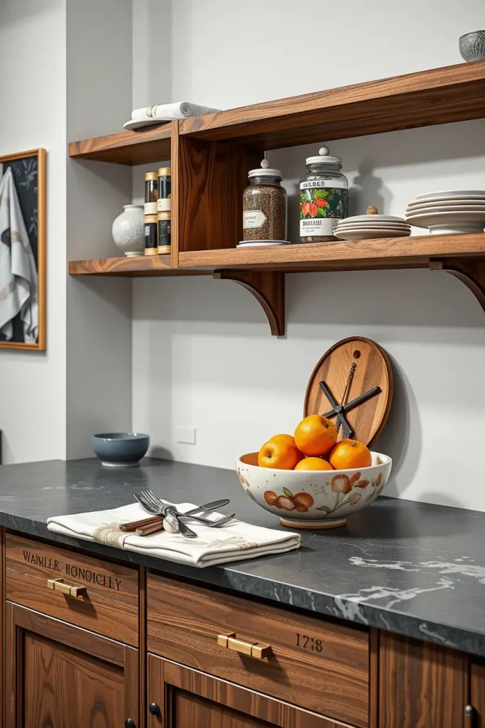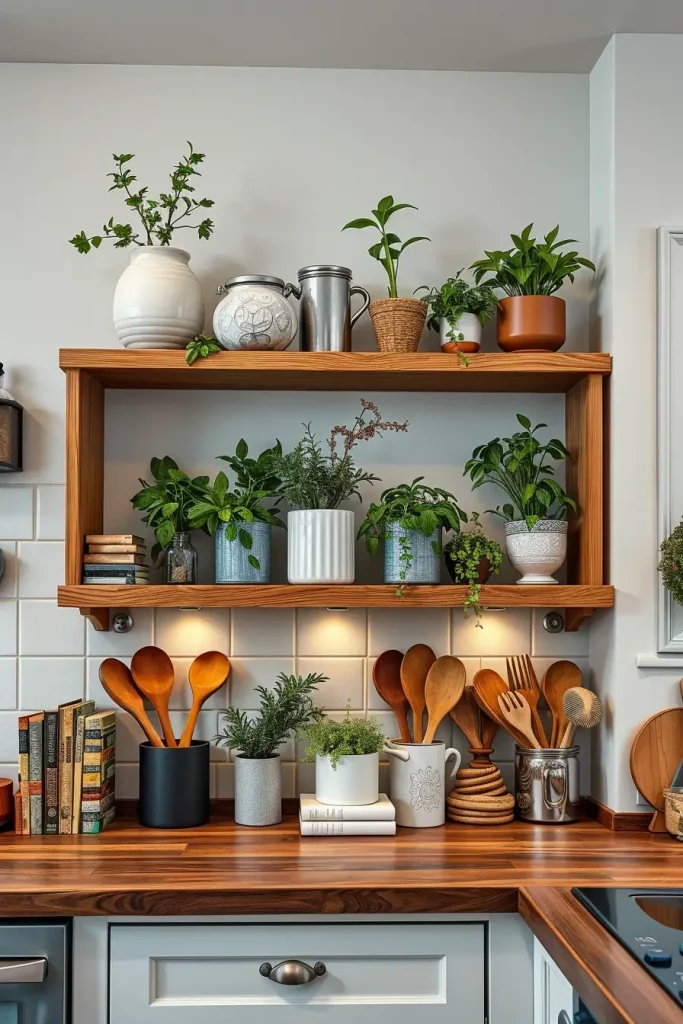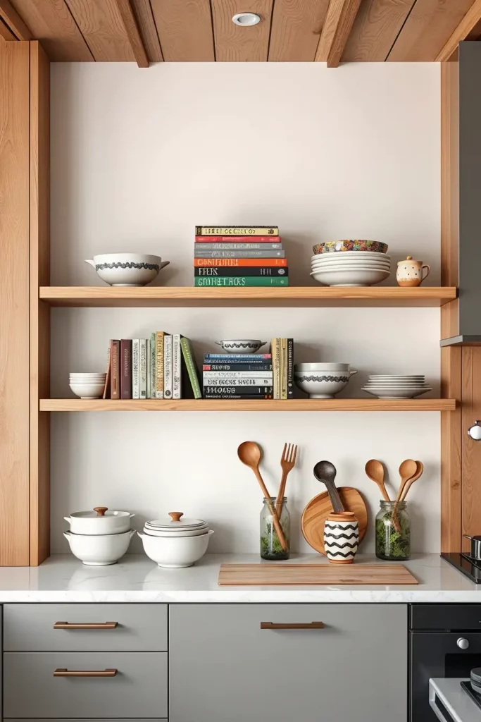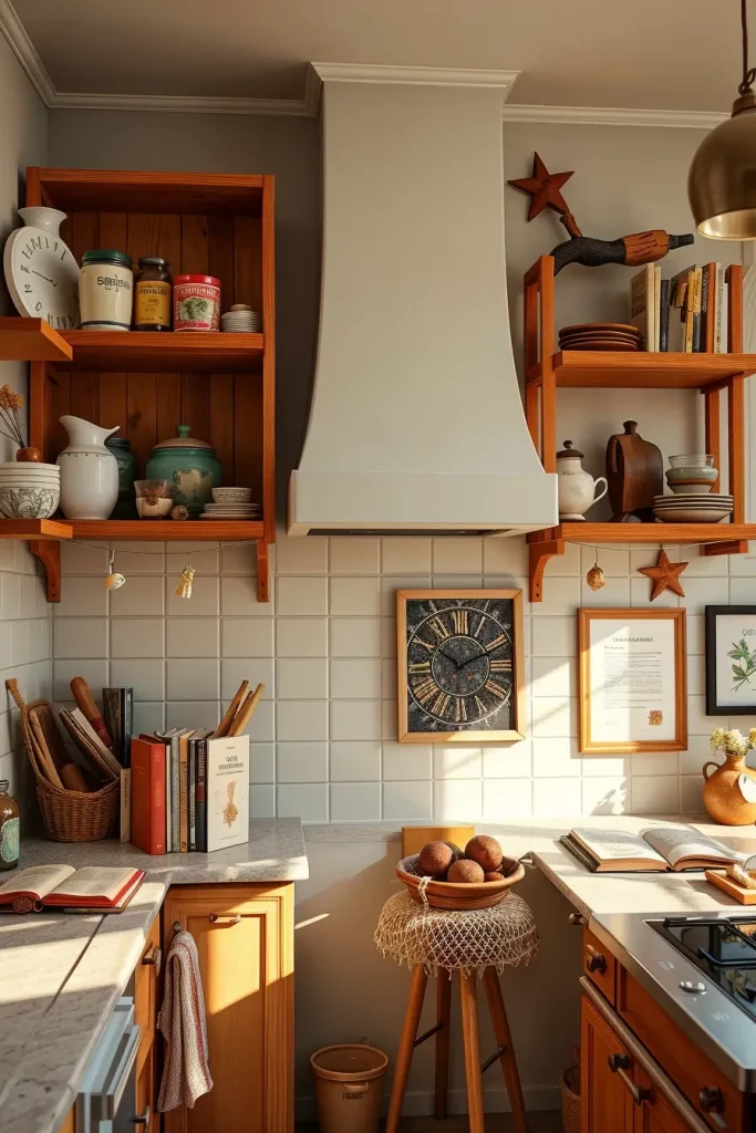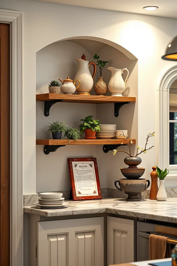 I almost invariably begin the process with family heirlooms or a travel souvenir or even a showcase of hand-thrown ceramic mugs. Those vintage spice tins tell stories, wooden cutting boards carry history, or even framed recipe cards from grandma’s kitchen carry the warmth and charm in my eyes. In my perspective, these items work incredibly to add warmth over practical items like stacked dishes or transparent glass jars filled with wholesome ingredients. By placing items that serve a purpose together with those that evoke emotion creates charm.