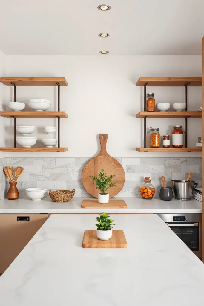 To achieve a classic aesthetic, I begin with light wood accents, including beech and ash cutting boards. They pair elegantly with white ceramics and clear glass. For a softer touch, I incorporate greenery with small potted herbs and draping eucalyptus. Natural textures are featured in lie covered cookbooks, ceramic canisters with wooden tops, and woven trays. For contrast that doesn’t interrupt a clean design, I use brass or matte black shelf brackets.