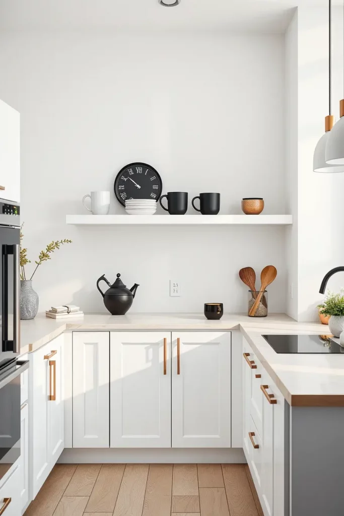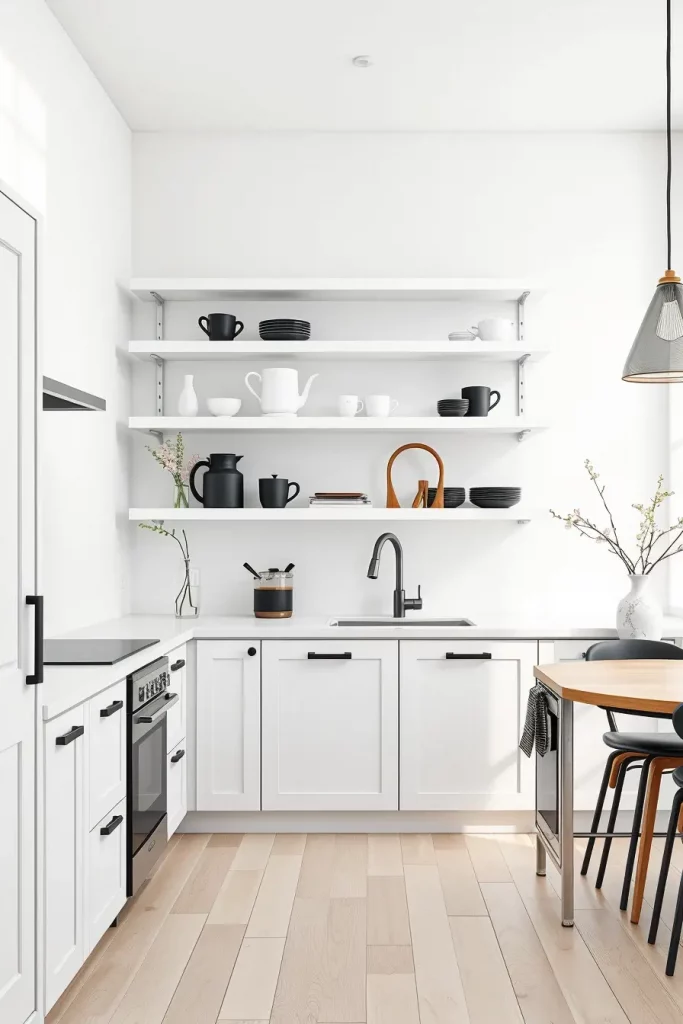 To enhance the uncluttered aesthetics, consider mounting floating shelves in light wood or solid matte white. That feeling should equally be maintained near the countertop, where only a few high-caliber items should be placed: a couple of mugs made of ceramic, a decanter which is made of glass and transparent, a salt grinder that’s matte black as well as a single cookbook featuring a muted cover. Nothing should clash with anything else visually and a lot of whitespace is to be provided around the remaining space, so balance is achieved.