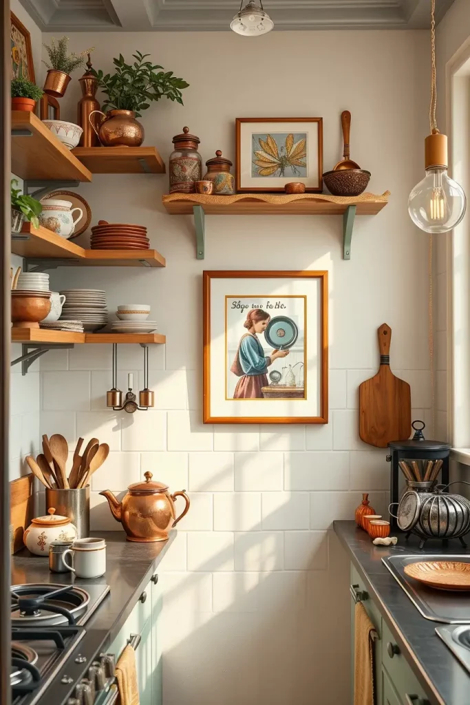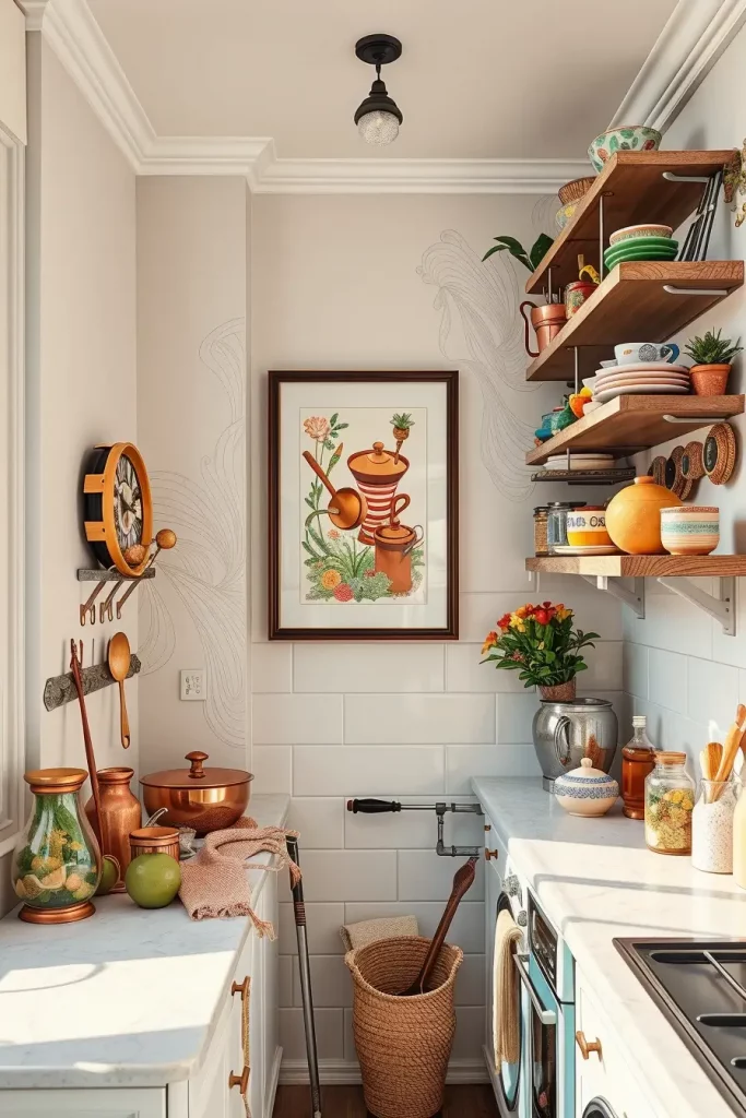 I styled kitchens with vintage botanical prints or fun food-themed illustrations and it never fails to start a conversation. Architectural Digest remarks that artwork in utility areas like kitchens turns them into fully designed rooms, not just functional areas.