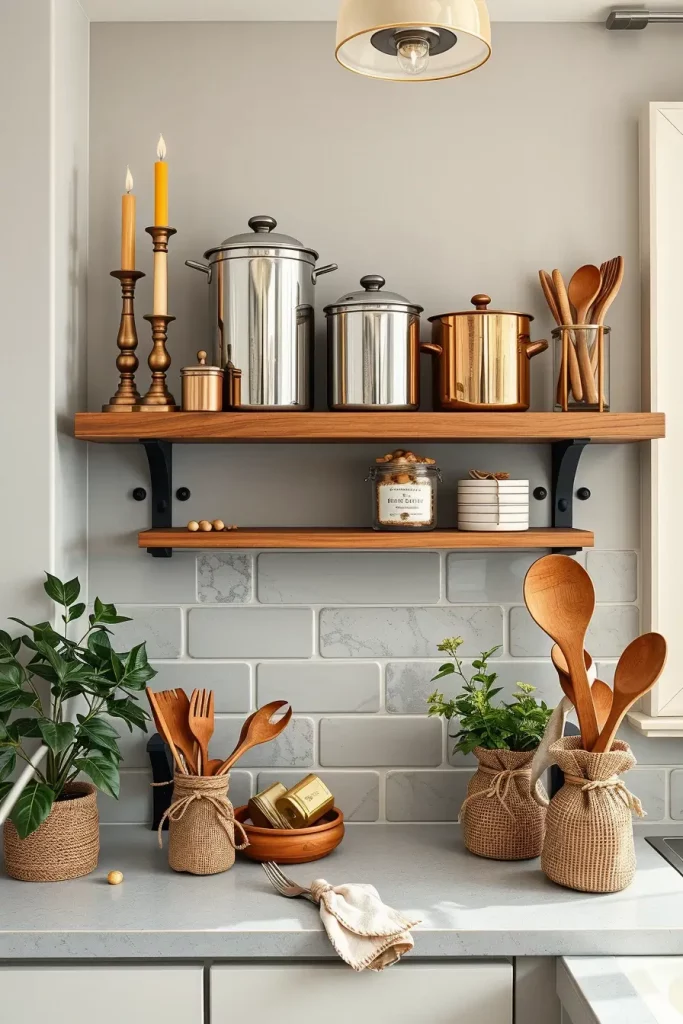 Mixing Metals And Natural Elements On Kitchen Shelves