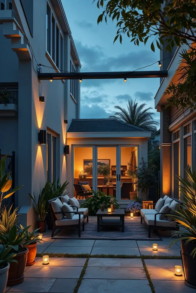 I typically integrate LED strips under seating, along deck edges, or beneath planters. Smart bulbs in overhead fixtures and lantern-style lights add another layer of control. Pairing these with minimalist outdoor furniture, such as modular sofas and glass-top tables, ensures the lighting remains the focal point without overwhelming the space.