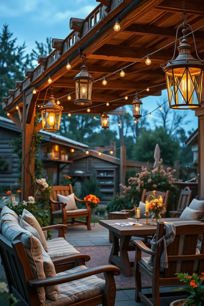 For a warmer and more nostalgic atmosphere, I often turn to lantern-inspired fixtures within outdoor lighting ideas patio 2026. This style works beautifully for rustic or farmhouse patios, creating a welcoming and timeless environment. The soft glow of lantern lighting adds depth and character, especially in natural settings.
