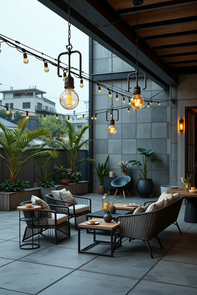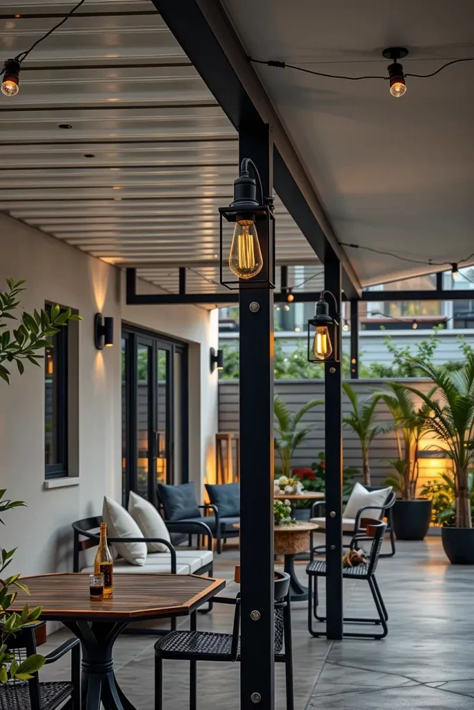 For modern patios, industrial lighting plays a key role in outdoor lighting ideas patio 2026. This style is defined by clean lines, exposed materials, and a slightly raw aesthetic. It works particularly well in urban environments or minimalist outdoor layouts.