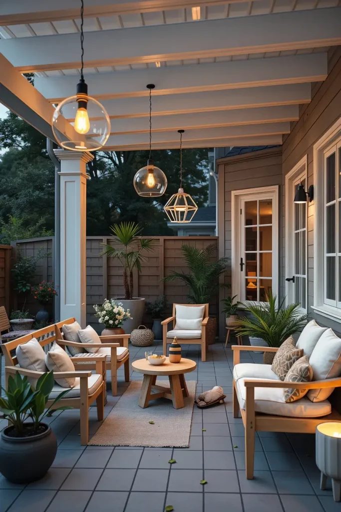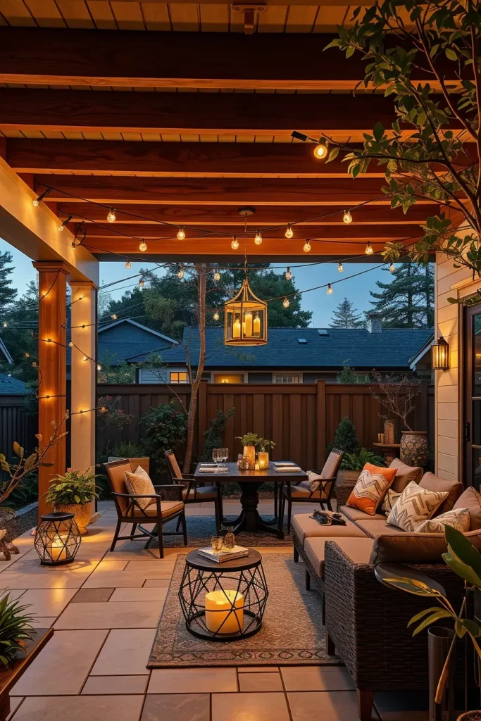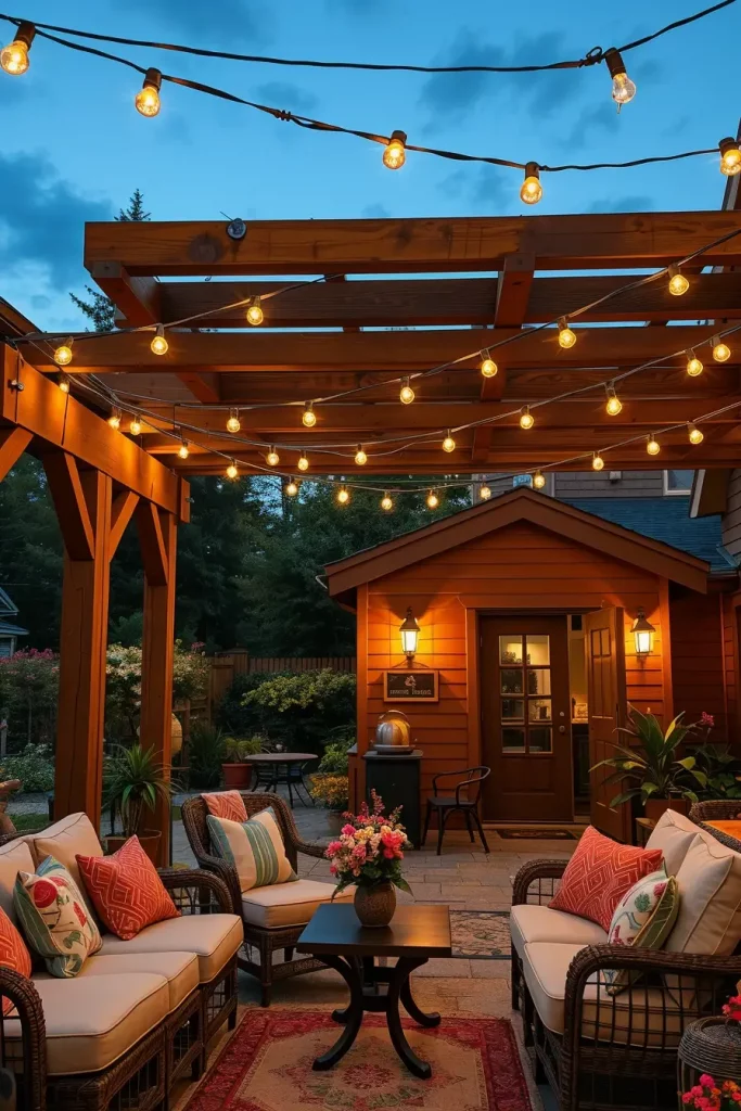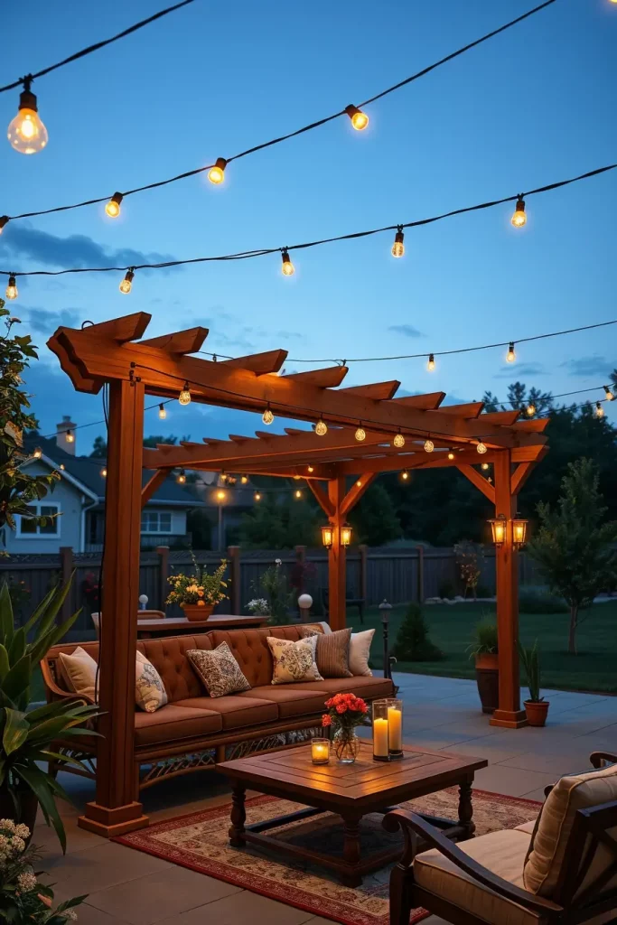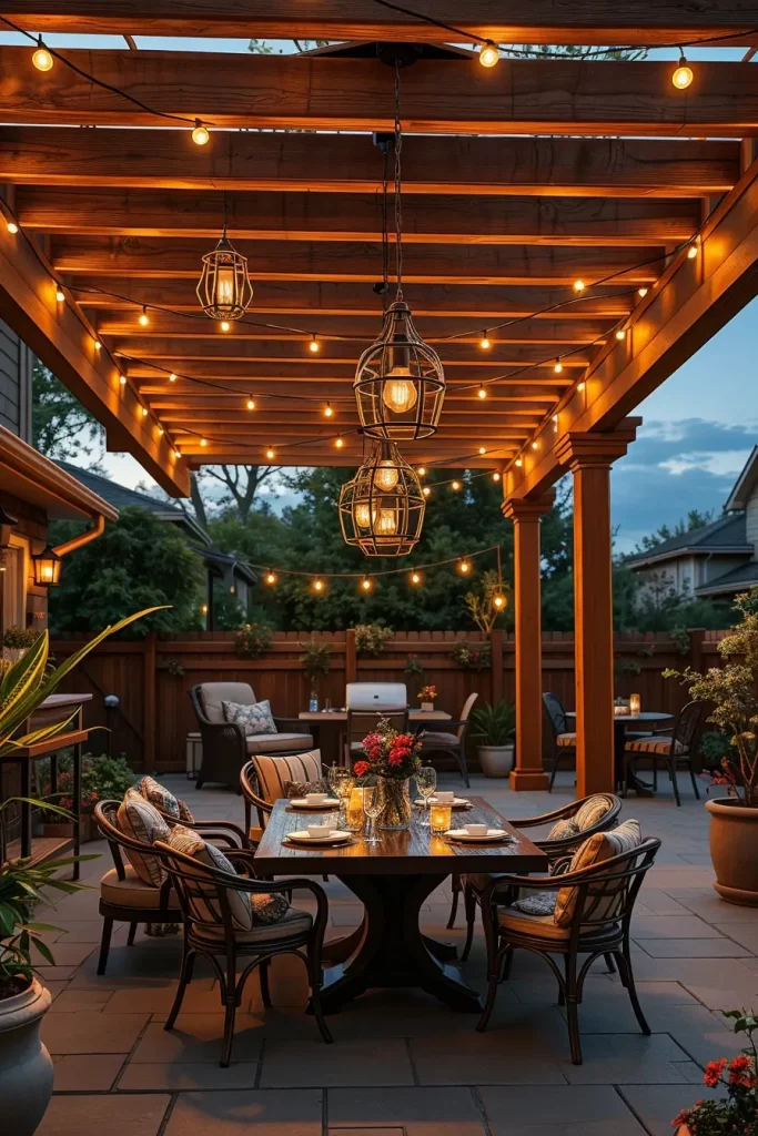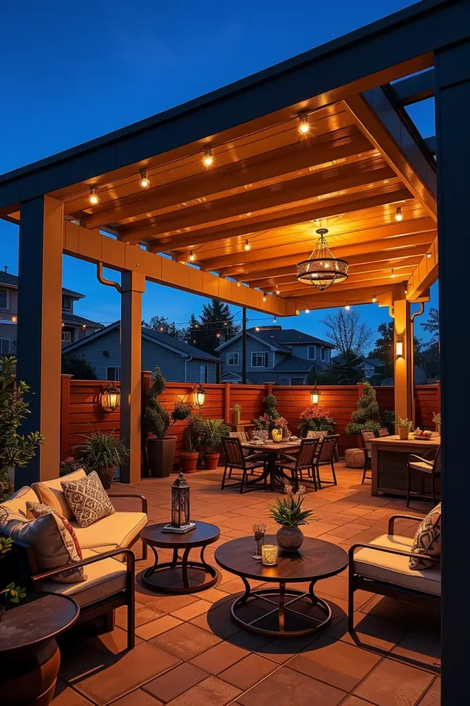 I typically use string lights draped across beams, pendant lights hanging at varying heights, and integrated LED strips along the structure. Combined with comfortable seating, outdoor rugs, and dining tables, this setup creates a cozy yet structured environment. I also recommend weather-resistant fabrics and coordinated color palettes to unify the design.