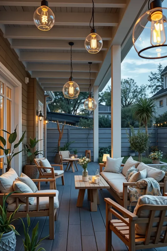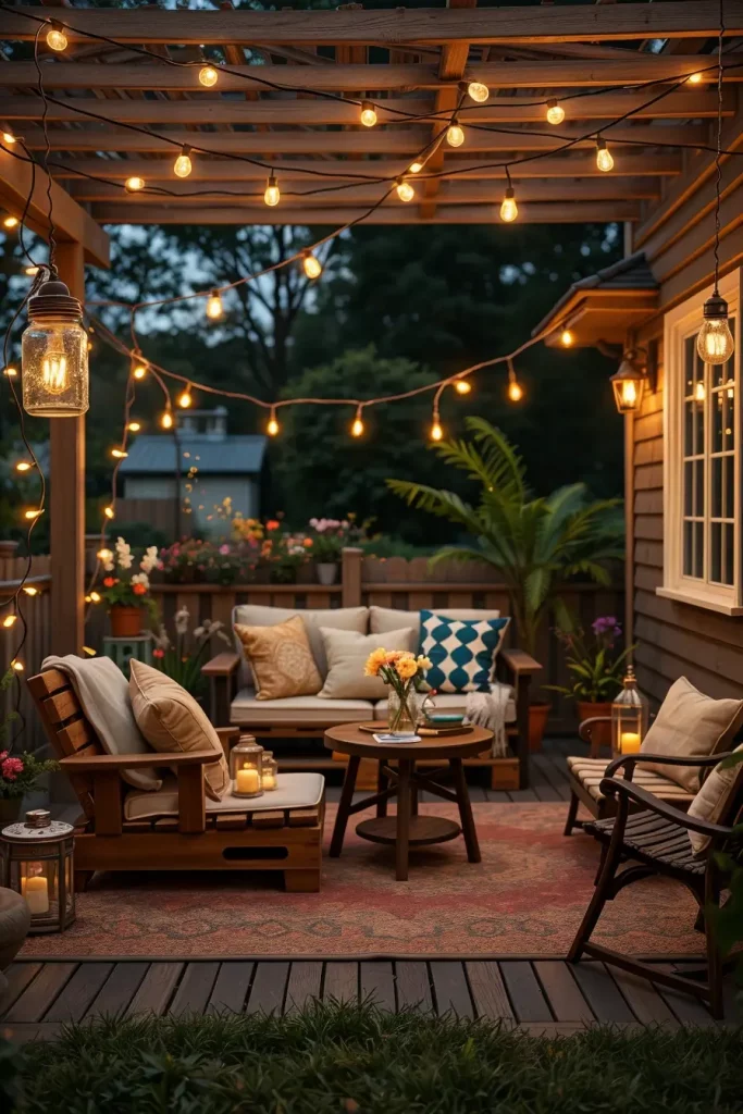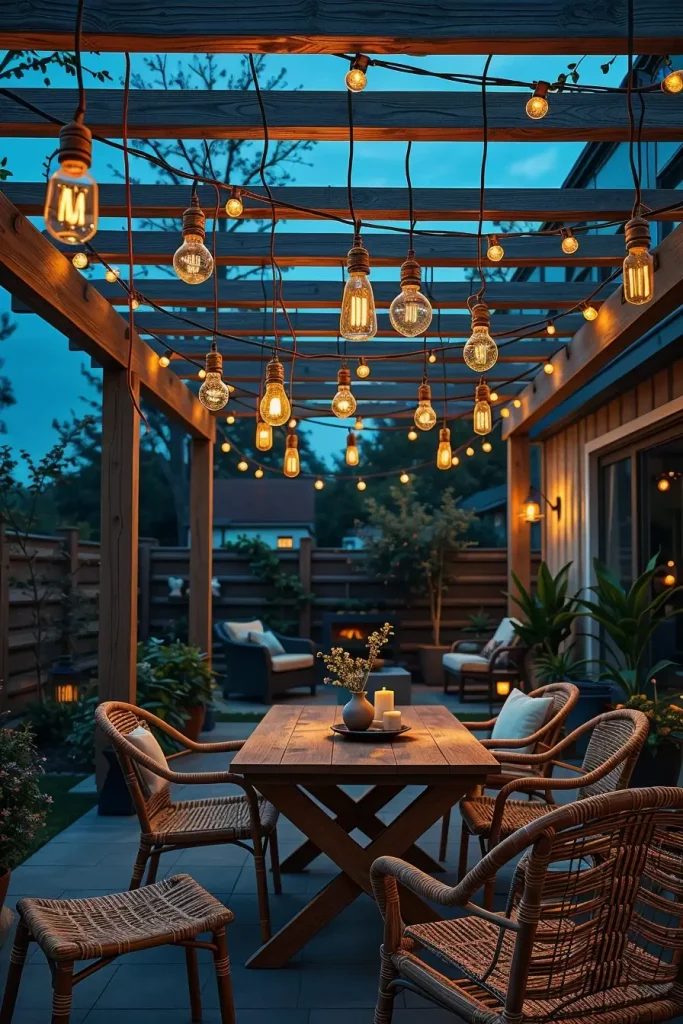 I usually recommend draping string lights across pergolas, fences, or overhead structures. Edison-style bulbs are particularly popular because they provide a soft, warm glow that enhances the cozy ambiance. Pairing them with comfortable seating, outdoor rugs, and throw pillows completes the look.