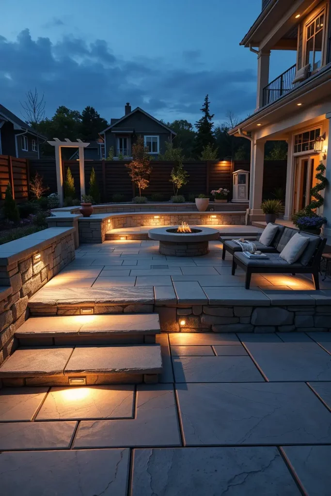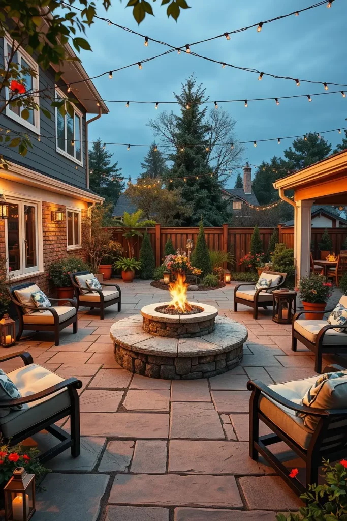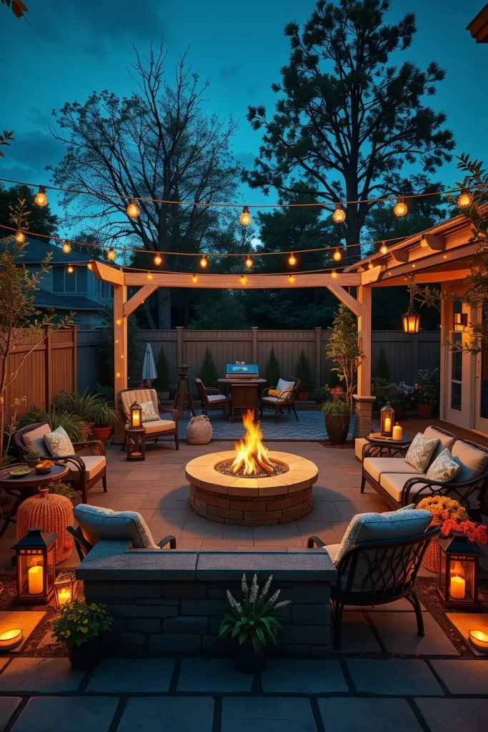 A fire pit naturally becomes the centerpiece of many patios, and I always integrate it thoughtfully into outdoor lighting ideas patio 2026. The warm glow of the fire creates a cozy and inviting atmosphere, but I find that additional lighting is necessary to fully support the space.