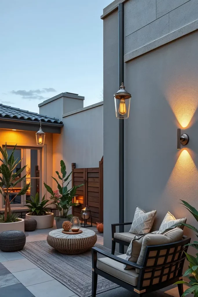 In my projects, I combine hanging lanterns, tabletop candle-style lights, and wall-mounted fixtures with metal or distressed finishes. These pair perfectly with wooden furniture, woven chairs, and linen cushions. I also like to incorporate natural elements such as stone pathways and greenery to enhance the rustic feel.