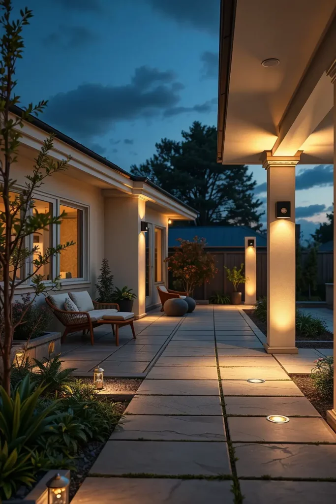 Hidden lighting is one of my favorite strategies when working with refined outdoor lighting ideas patio 2026. This technique focuses on indirect illumination, creating a soft glow that highlights architectural elements without exposing the light source itself. It’s ideal for those who prefer understated elegance and a seamless design.