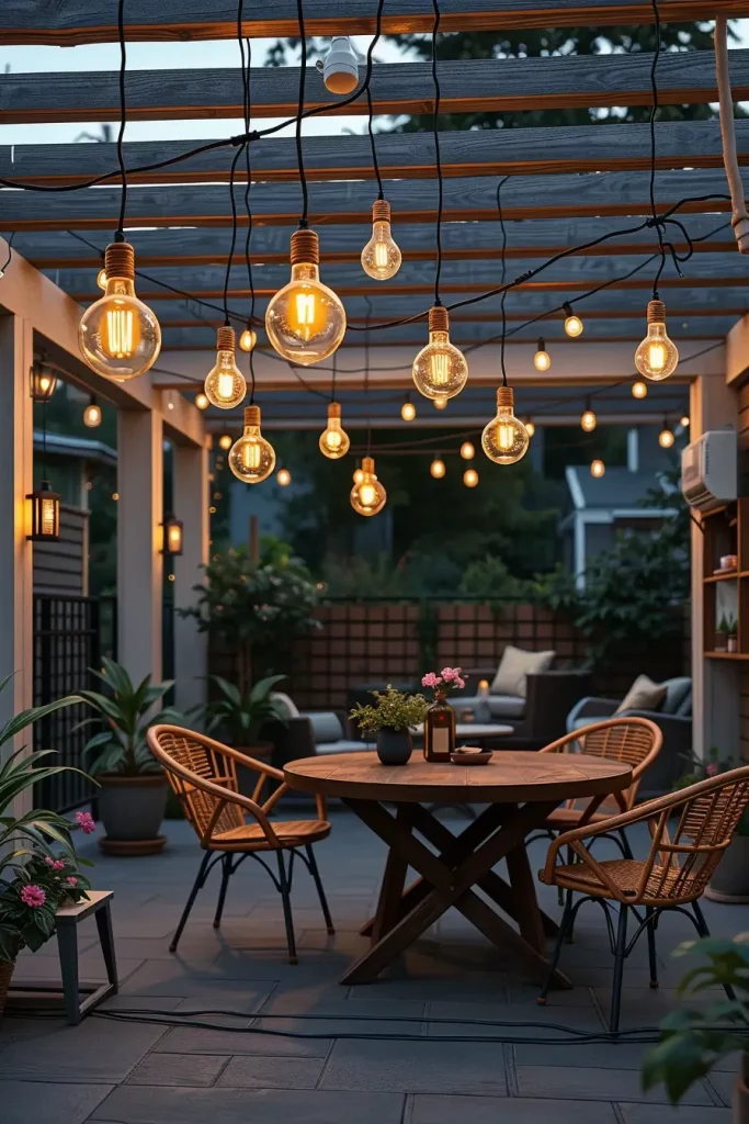 I find that hanging bulb installations instantly create a stylish and contemporary atmosphere on any patio. Suspended string lights or individual bulbs arranged at varying heights add depth and visual interest while softly illuminating the entire space. This approach works particularly well in open patios where I want to define a cozy seating or dining area without adding bulky structures.