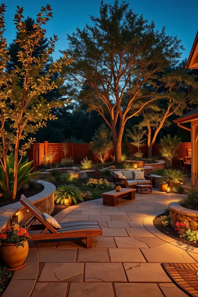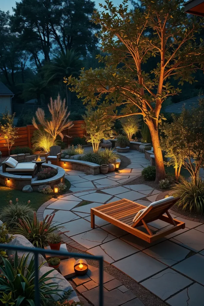 In practice, I use ground spotlights, hidden LED strips, and solar garden lights to highlight plants, trees, and pathways. Furniture choices such as stone benches, wooden loungers, and natural fiber textiles complement this organic lighting design. I also ensure that the lighting temperature stays warm to maintain a natural feel.